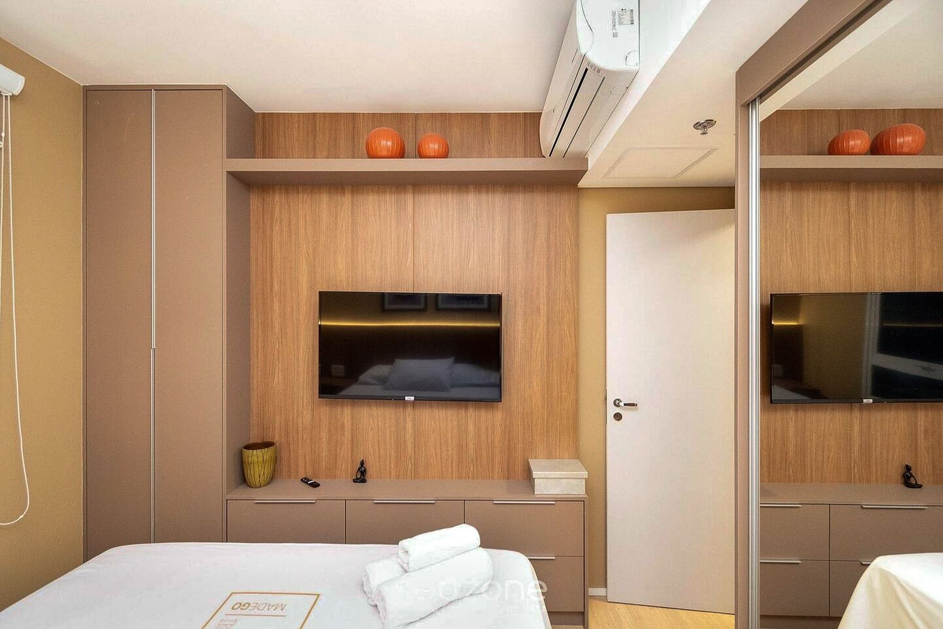 - 1 Quarto 1 com cama de casal queen size, armário, smart TV de tela plana e ar-condicionado;