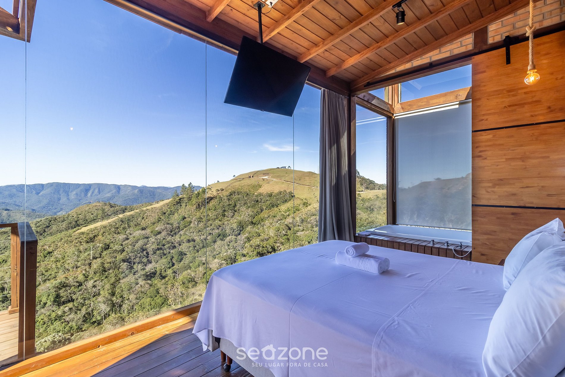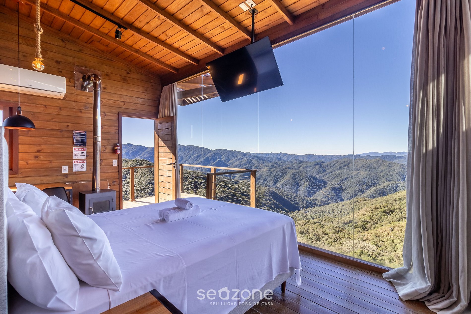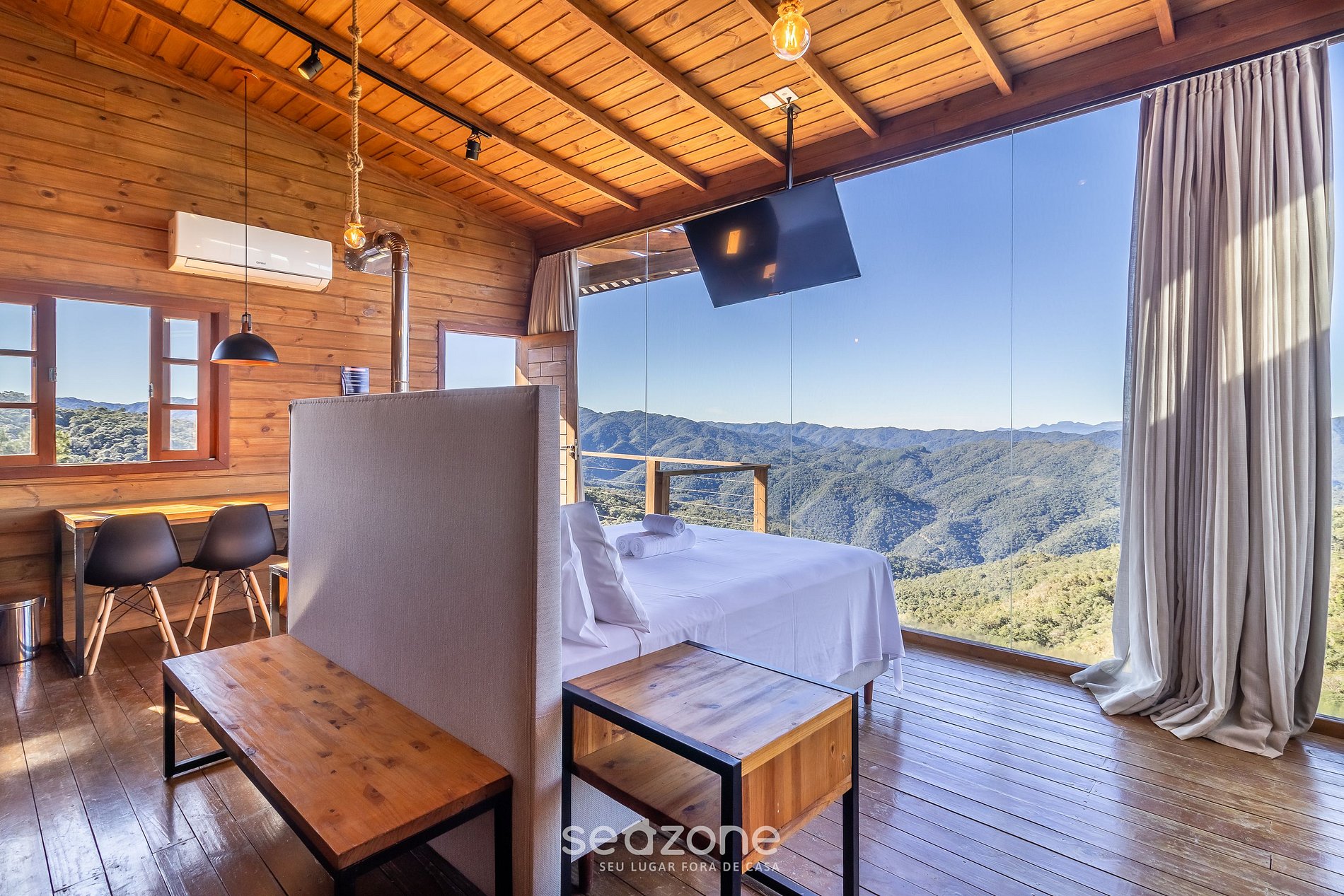 Unindo o rústico ao sofisticado, essa cabana é o ambiente ideal para uma hospedagem de luxo em meio a natureza. Além de aconchegante, oferece uma vista deslumbrante das montanhas, perfeita para aproveitar dias românticos a dois.