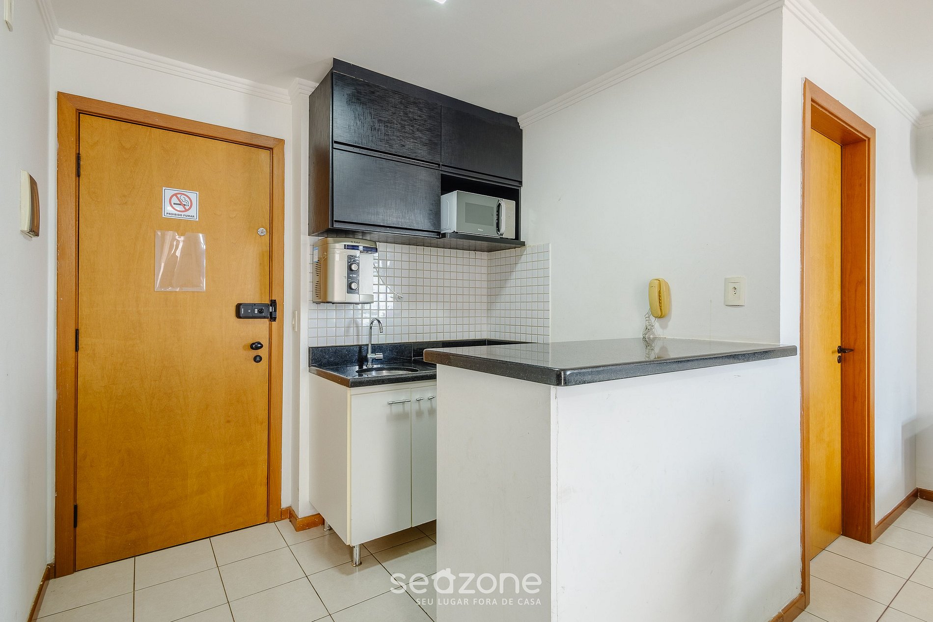 - Cozinha frigobar, fogão cooktop, micro-ondas, sanduicheira, cafeteira, liquidificador, taças de vinho, panelas, louças e utensílios;