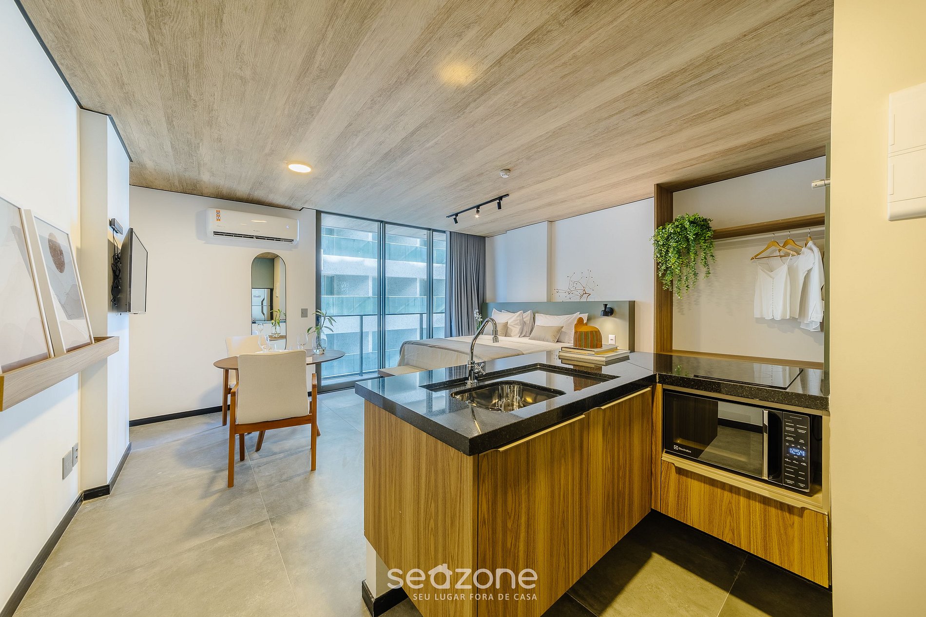 Studio moderno com vista lateral pro mar, cama queen, ar-condicionado, smart TV, cozinha equipada e varanda acolhedora. No prédio: piscina, academia, salão de jogos e brinquedoteca. A poucos passos da Praia da Pajuçara e perto de tudo: restaurantes, mercado, da feirinha de artesanato e pontos turísticos.