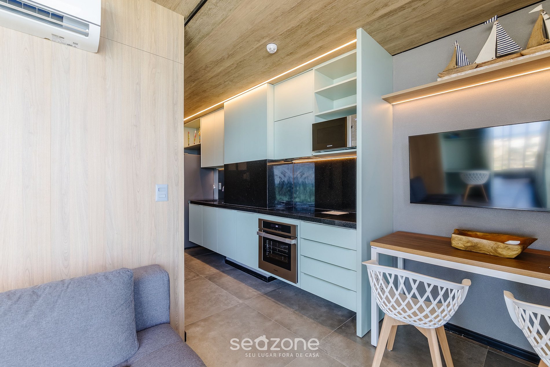 - Sala com sofá-cama solteiro, espaço para notebook, Smart TV de tela plana e ar-condicionado;