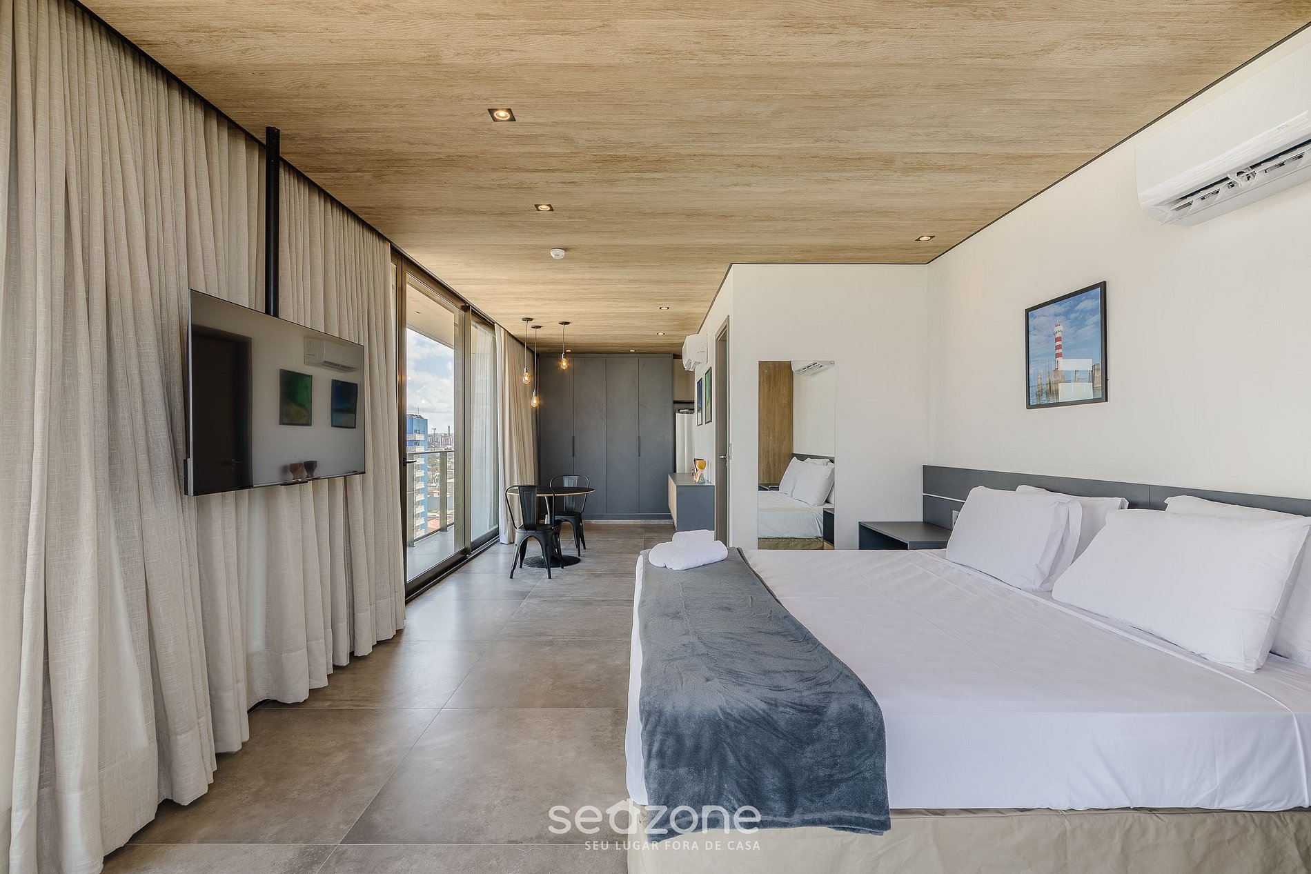 - 1 cama de casal king size, cortinas blackout, armário, smart TV, e ar-condicionado;