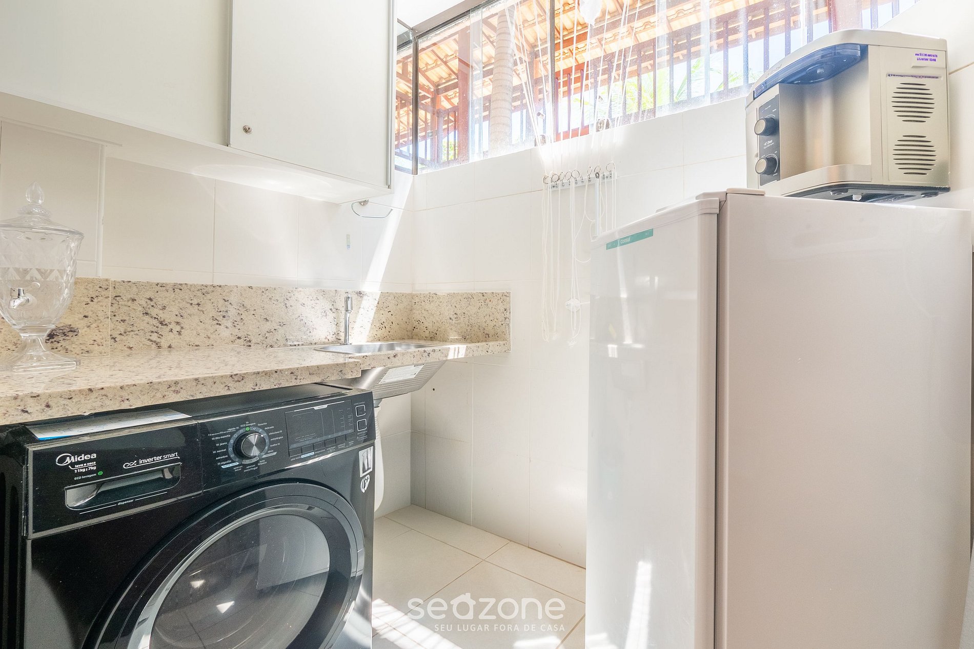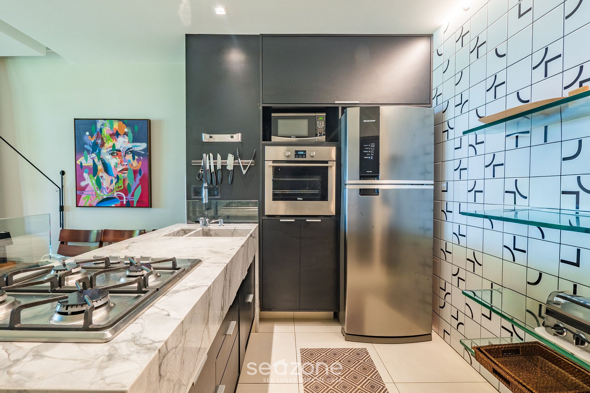 - Cozinha completa com geladeira, fogão cooktop, forno elétrico, micro-ondas, sanduicheira, cafeteira, chaleira, liquidificador, taças de vinho, panelas, louças e utensílios;