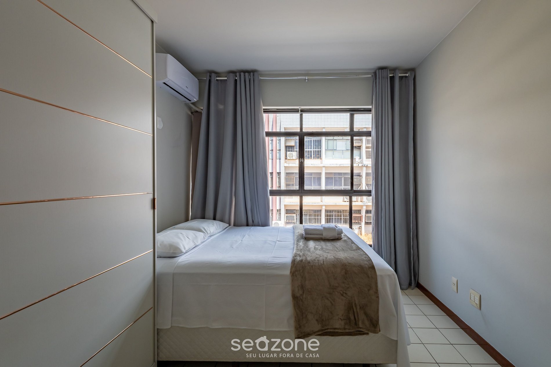 - 1 Quarto com 1 cama de casal queen size, armário, cortinas blackout e ar-condicionado;