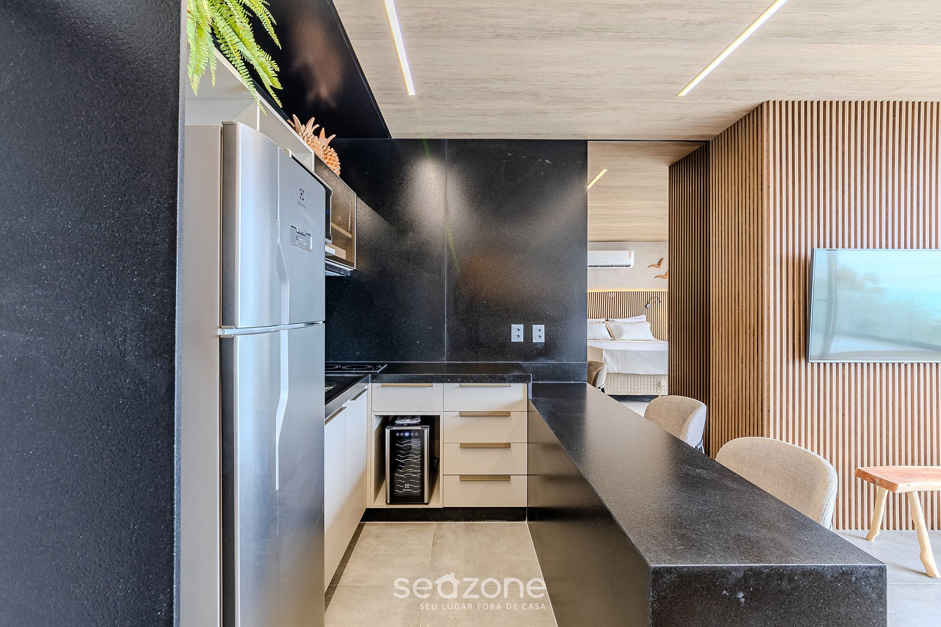 - Cozinha com frigobar, adega elétrica, fogão cooktop e micro-ondas;
