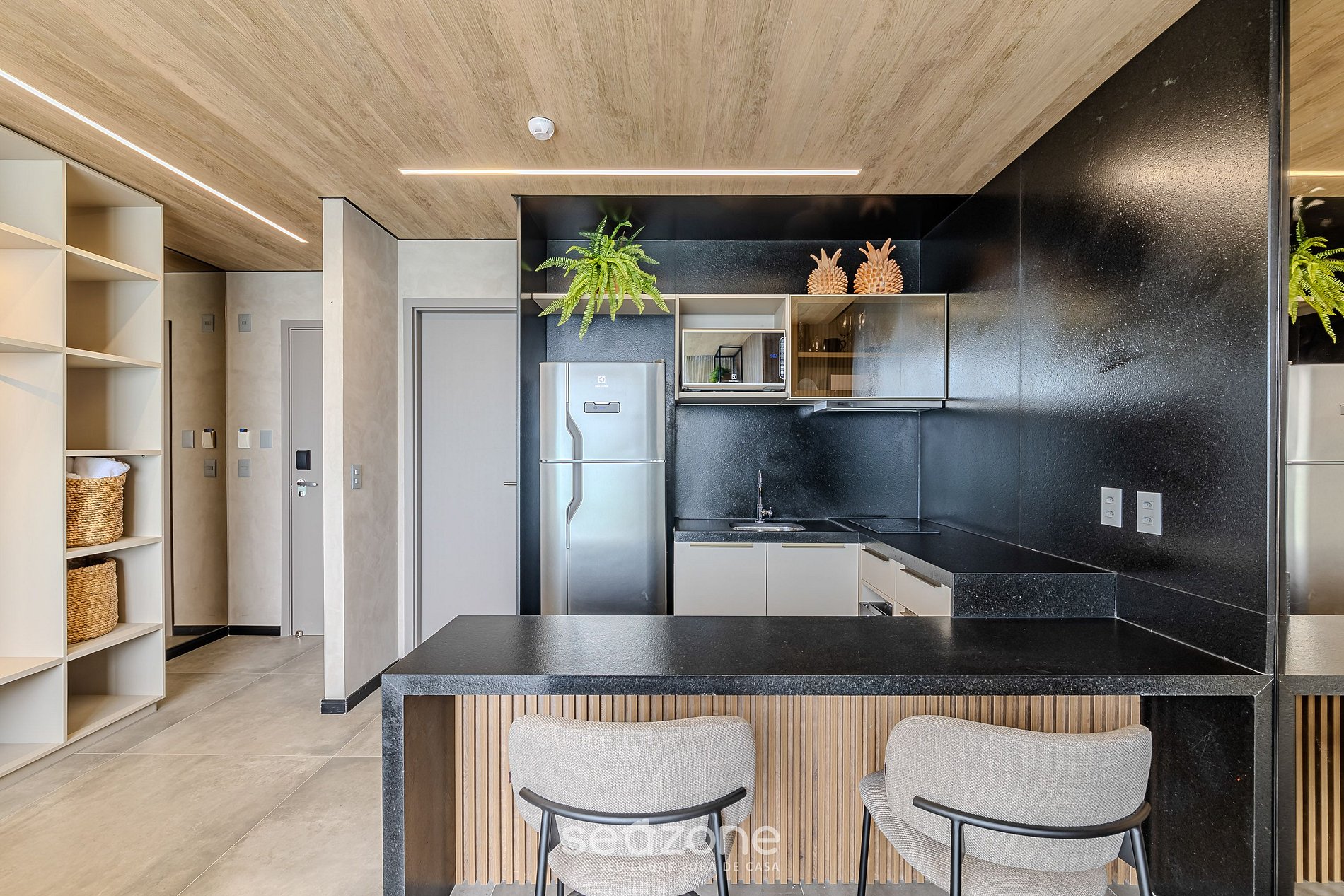 - Cozinha com frigobar, adega elétrica, fogão cooktop e micro-ondas;