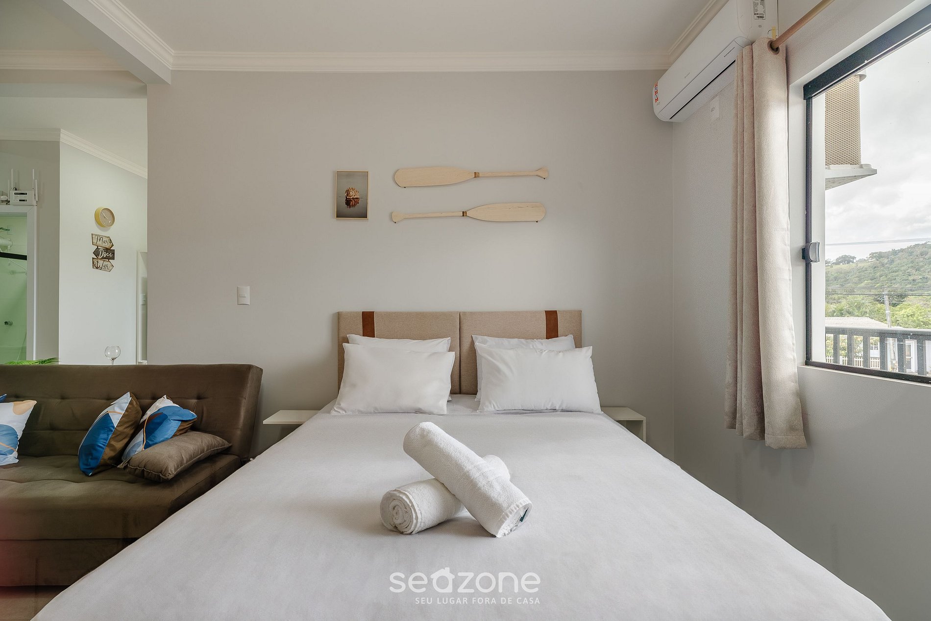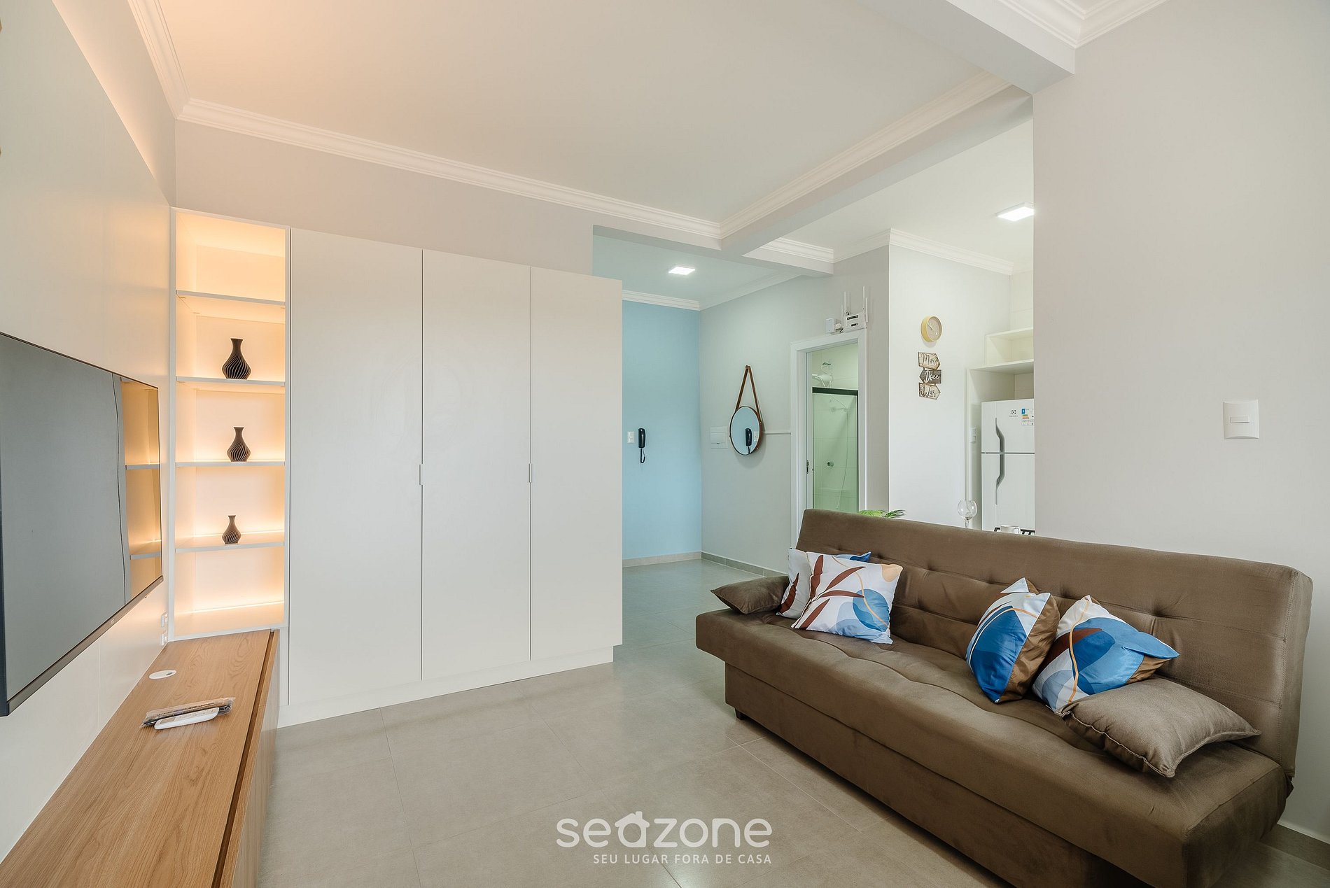 - Estúdio com 1 cama de casal queen size, 1 sofá-cama de solteiro, smart TV, armário e ar-condicionado;