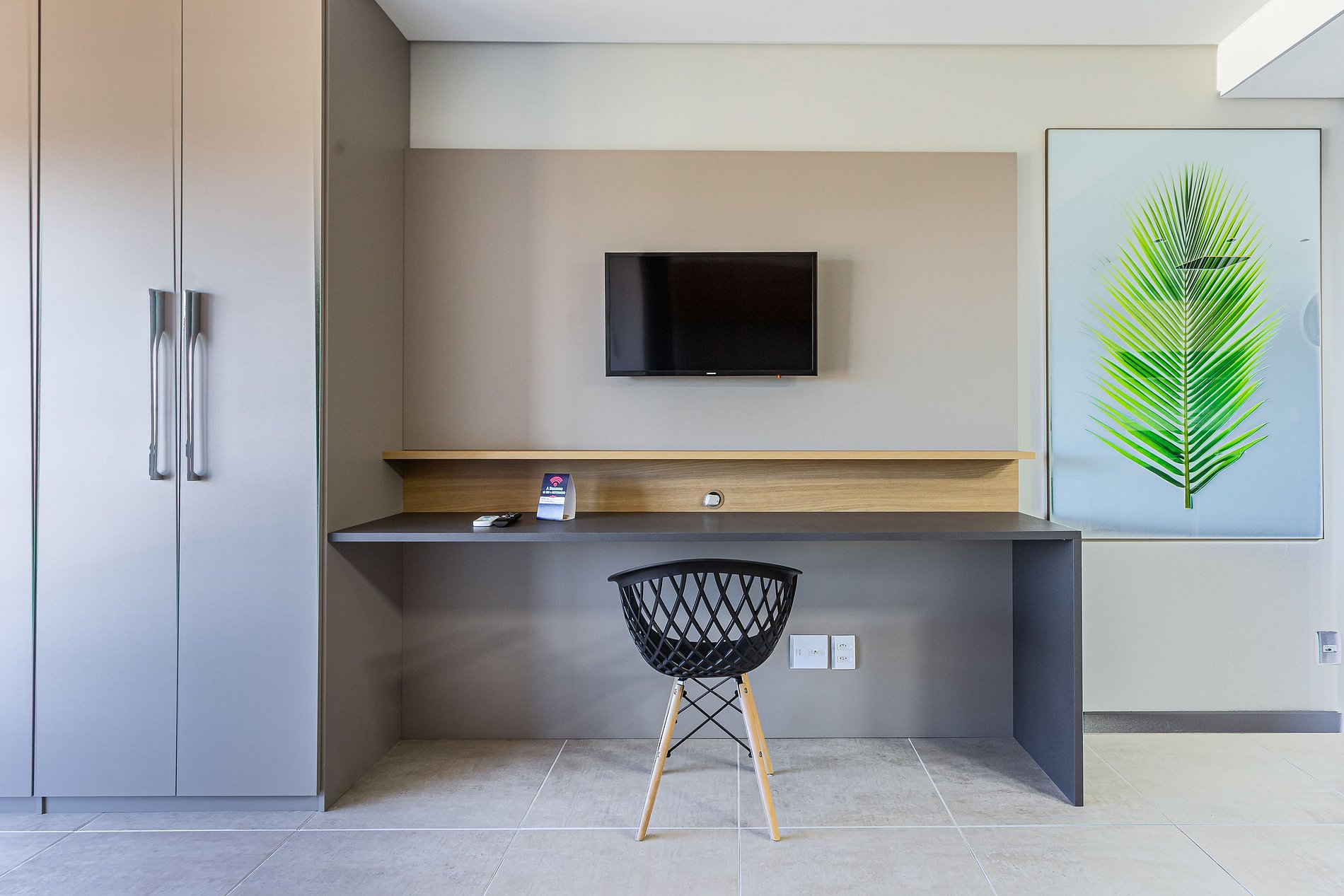 - Studio com cama de casal, sofá- cama (apenas para 1 pessoa), armário, TV e cozinha integrada;