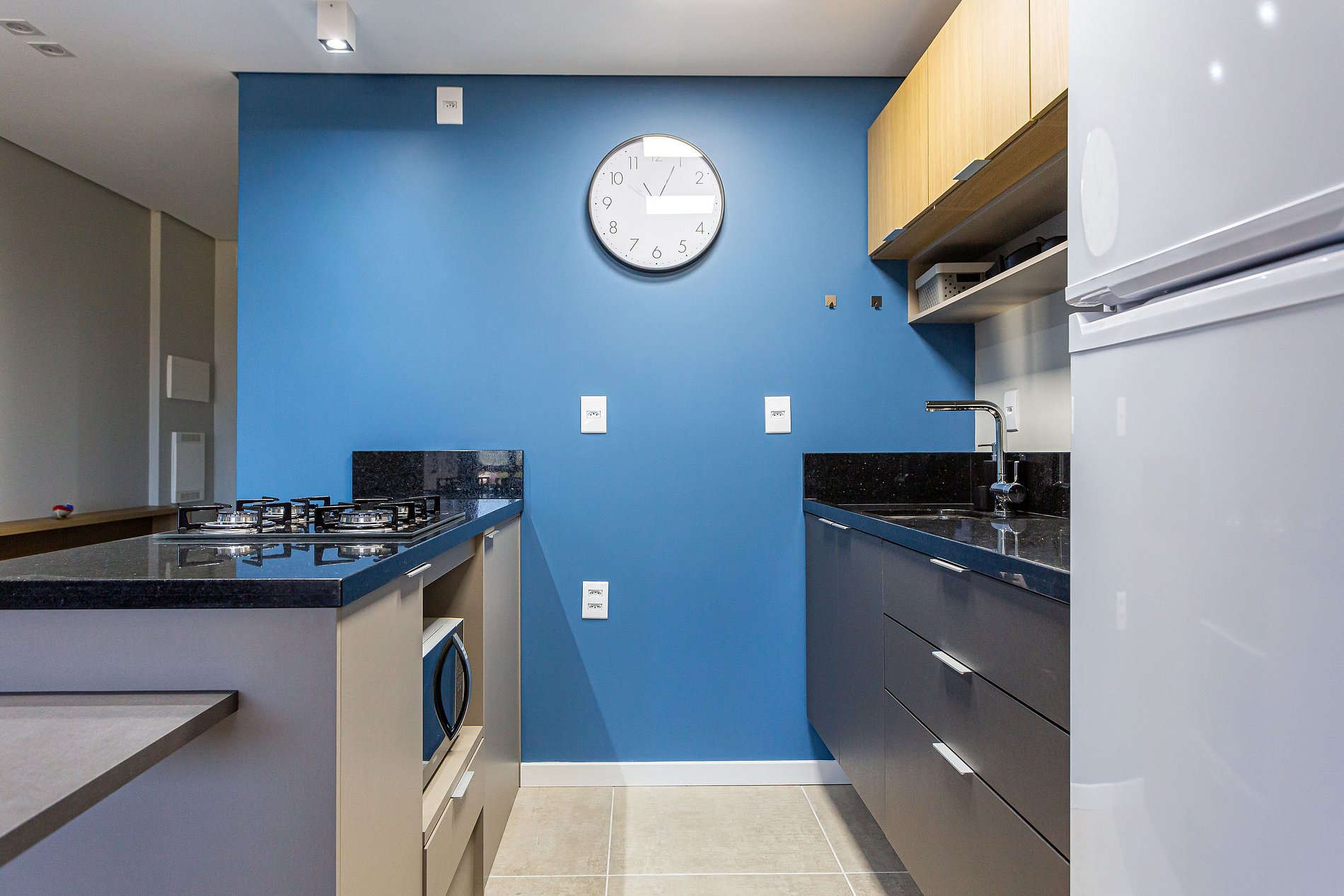 - Cozinha estilo americana com bancada para refeições, geladeira, fogão, micro-ondas, cafeteira e utensílios;