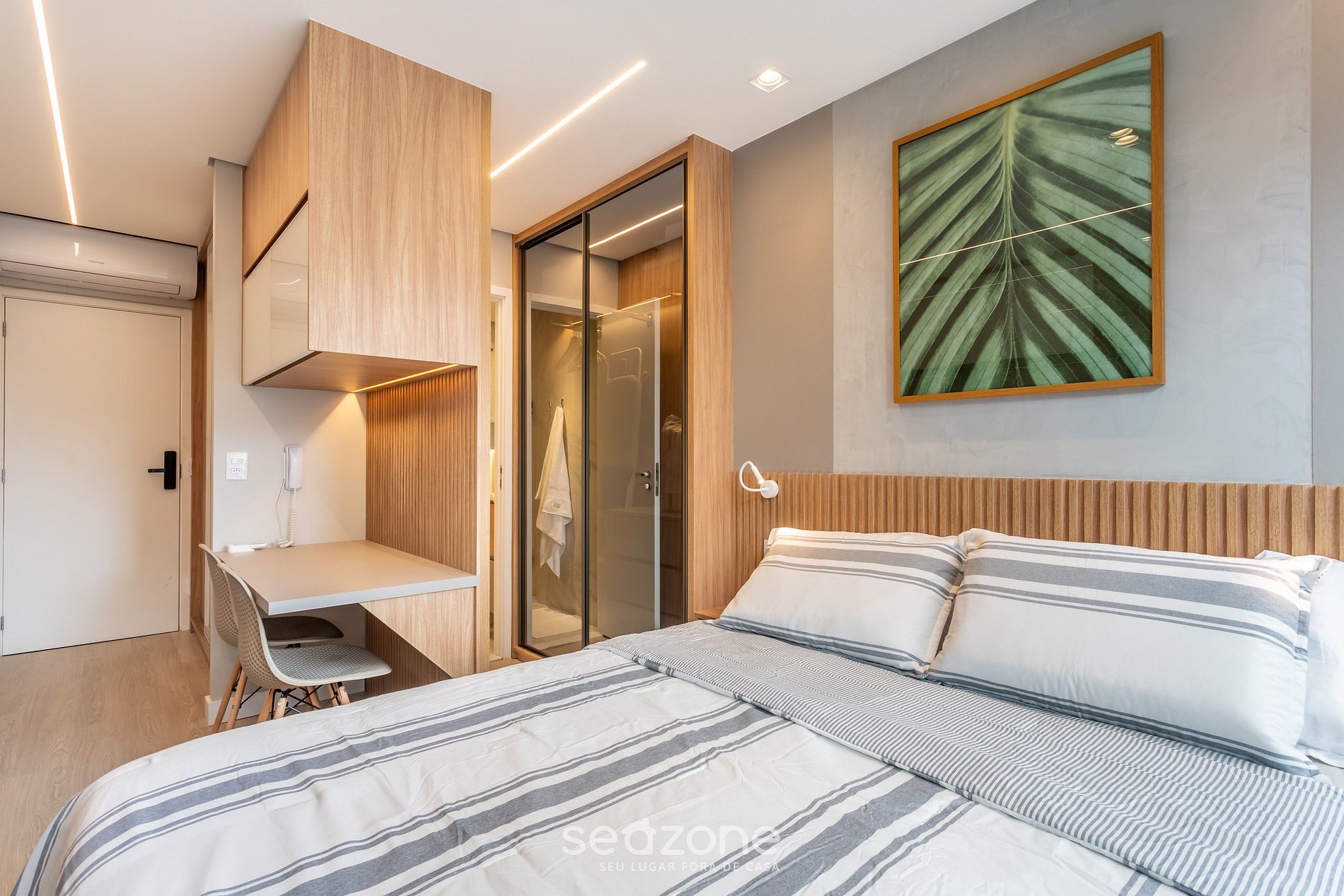 - Cama casal queen, armário, TV Smart, ar-condicionado e espaço para trabalho;