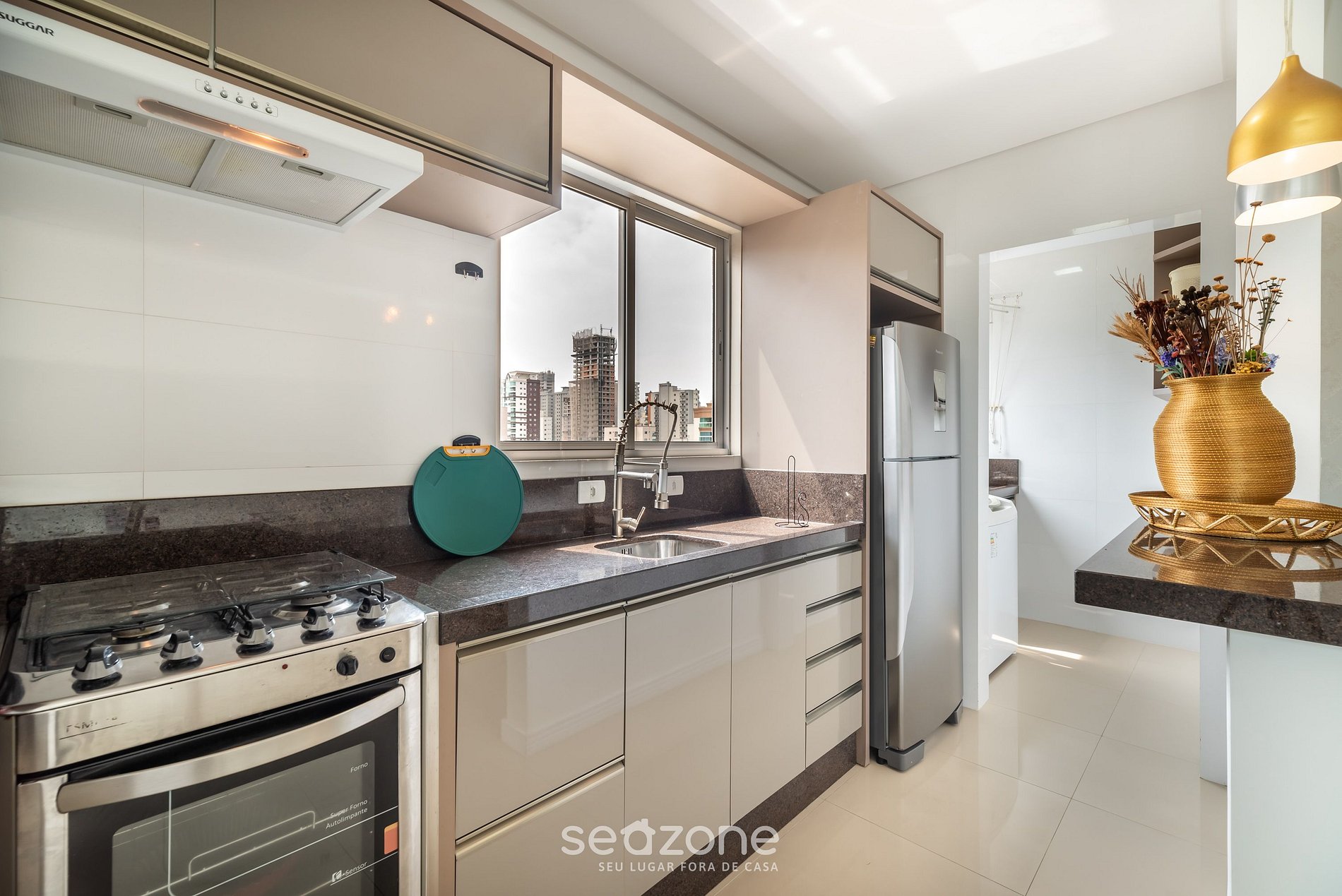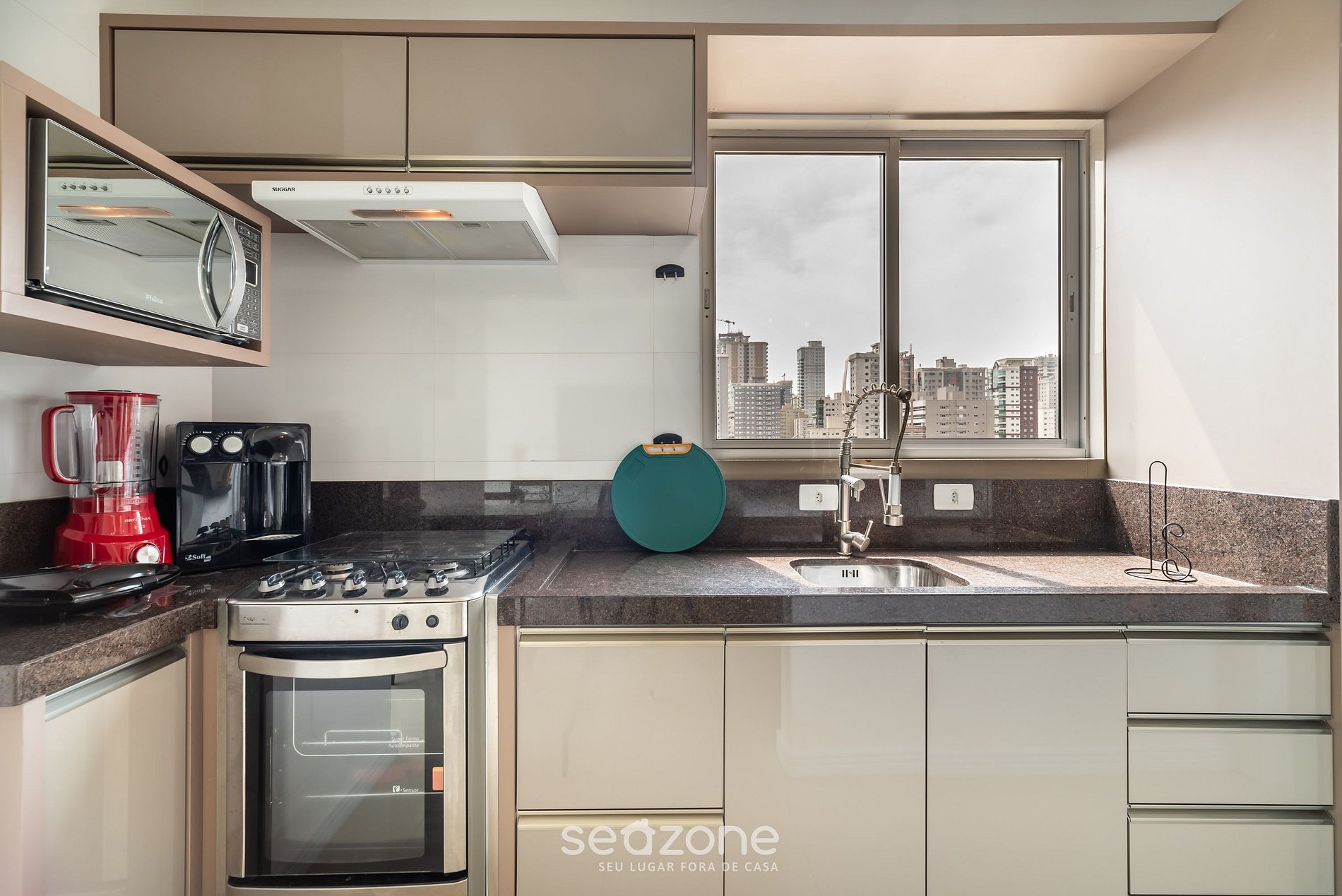 - Cozinha completa com geladeira, fogão e forno a gás, micro-ondas, sanduicheira, kit café (funil, garrafa térmica), chaleira elétrica, liquidificador, taças de vinho, panelas, louças e utensílios;