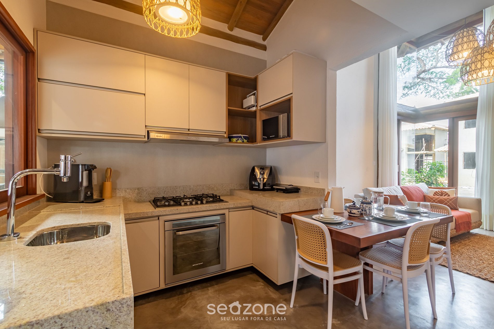 - Roupas de cama/banho e limpeza extras são solicitadas e pagas à parte, direto com a Seazone;