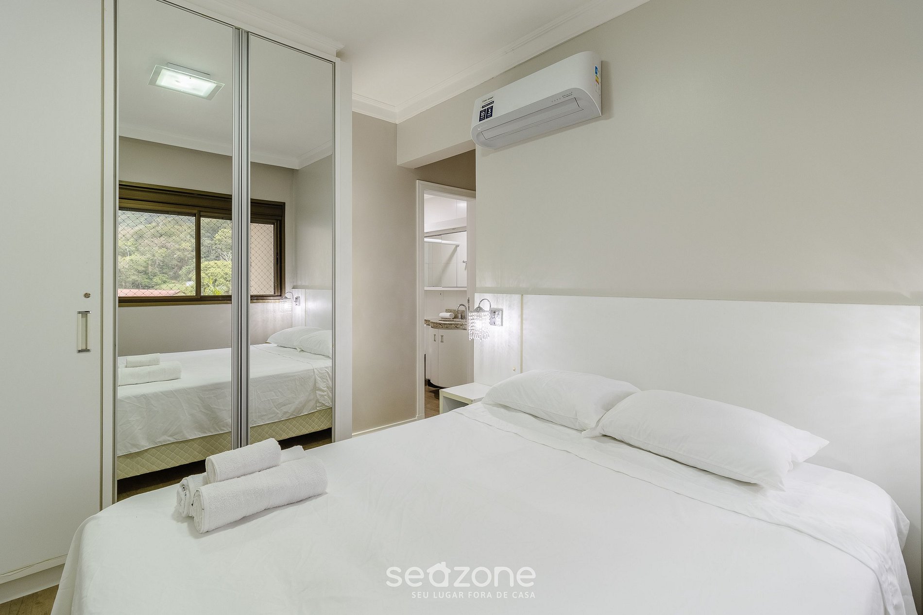 - 1 Quarto com 1 cama de casal, cortinas, armário e ar-condicionado;