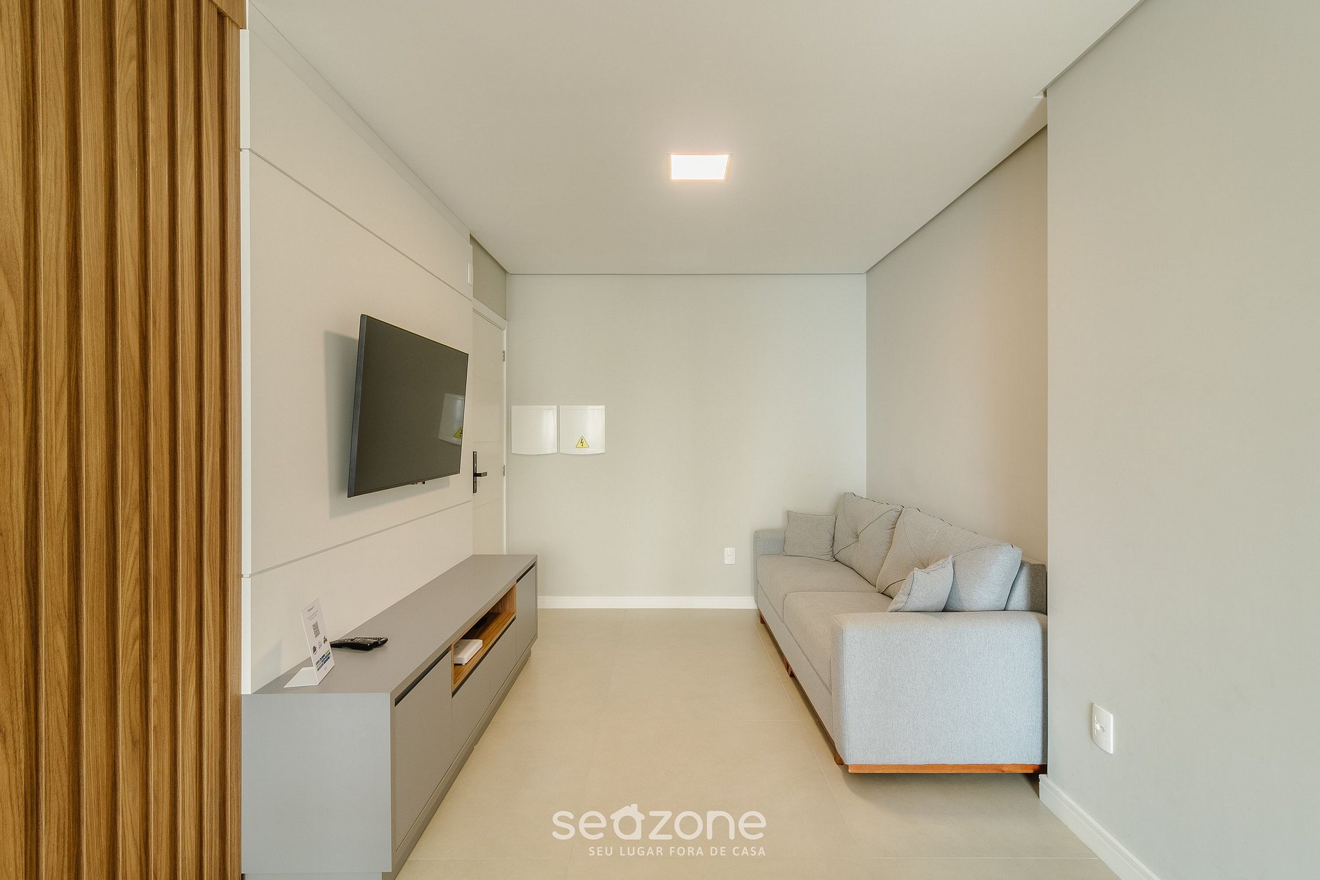 - Sala de estar com sofá, smart TV e ventilador;