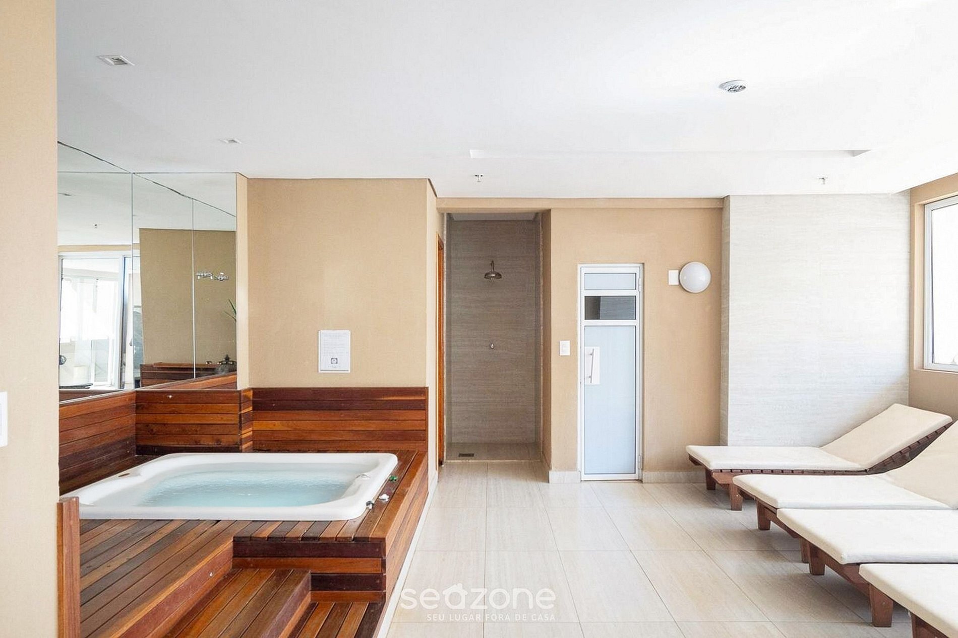 Condomínio com jacuzzi, sauna, lavanderia, portaria 24 horas e outros.