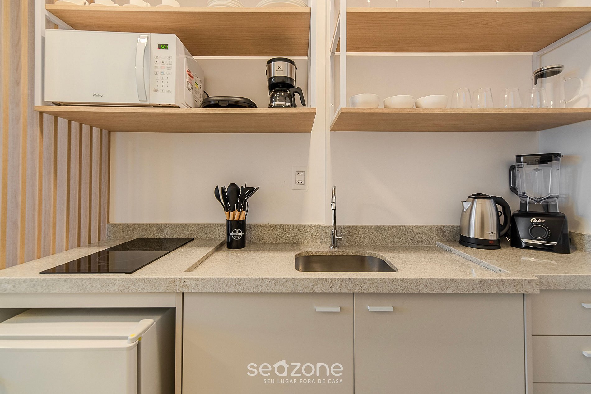 - Frigobar, fogão cooktop, micro-ondas, cafeteira elétrica, chaleira elétrica, sanduicheira, taças de vinho, louças e utensílios;