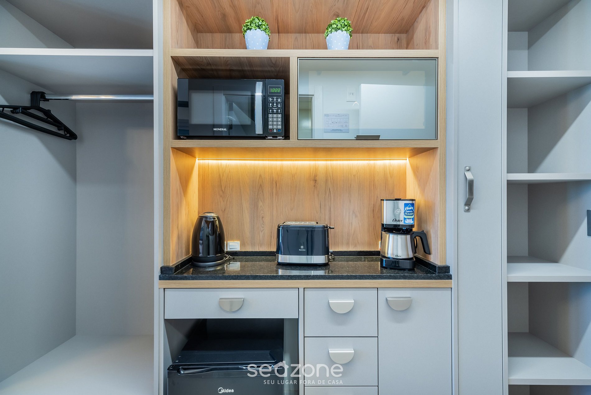 - Cozinha compacta com micro-ondas (sua opção prática para refeições rápidas durante a estadia), além de frigobar, cafeteira, chaleira elétrica, taças de vinho, louças e utensílios essenciais para o dia a dia;