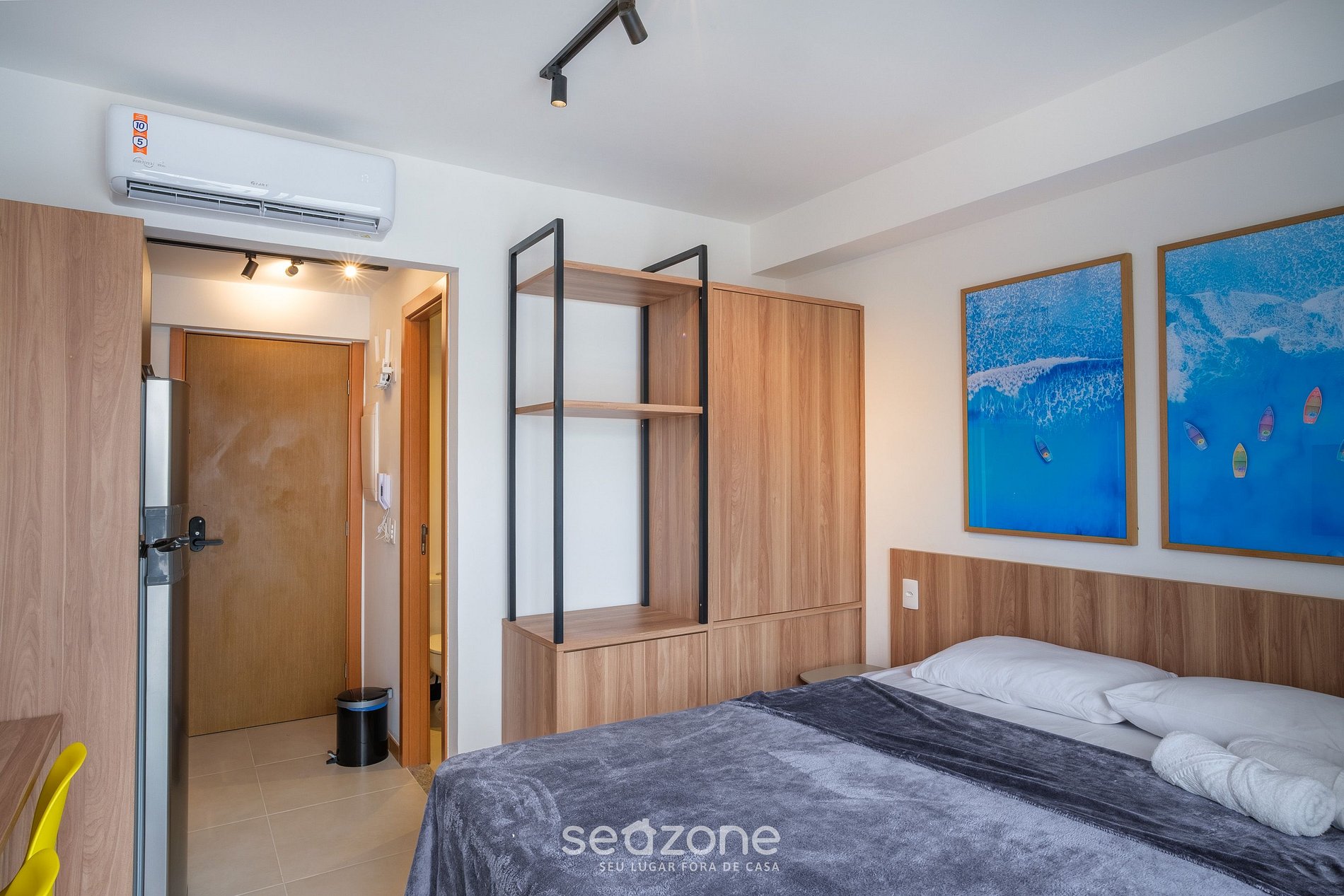- 1 estúdio com 1 cama de casal queen size, smart TV de tela plana, cortinas blackout, armário e ar-condicionado;