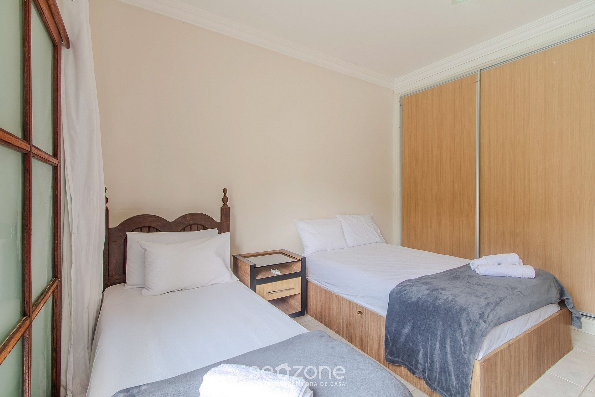 - 1 Quarto com 1 cama de casal, 1 cama de solteiro, cortinas comum/blackout, armário e ar-condicionado;