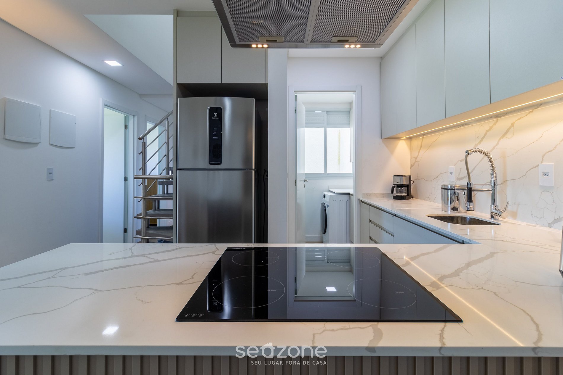 - Cozinha completa com geladeira, fogão cooktop, forno elétrico, micro-ondas, sanduicheira, cafeteira elétrica, chaleira, liquidificador, taças de vinho, panelas, louças e utensílios;