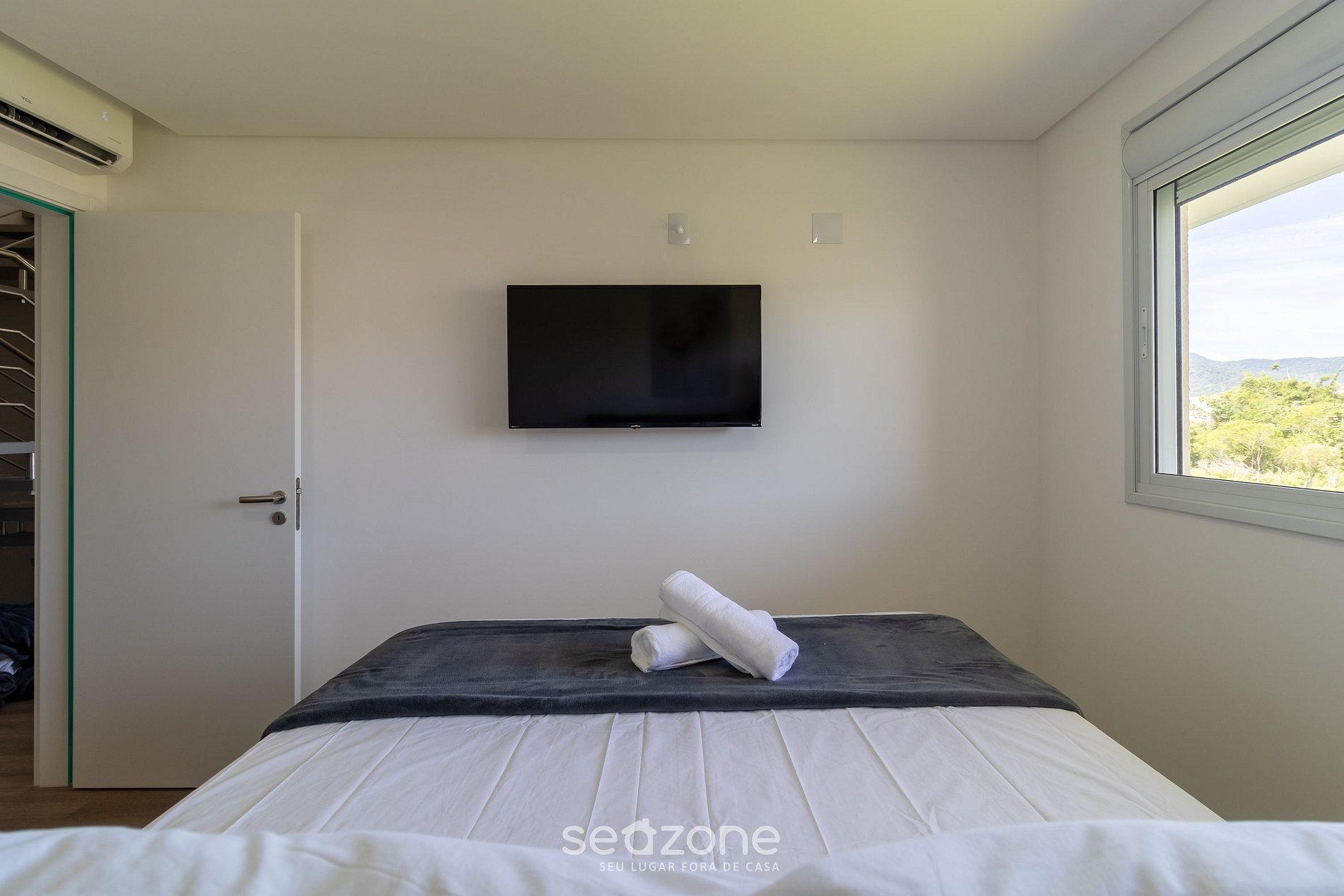 - 1 Quarto com cama de casal queen size, armário (cômdoda), Smart TV e ar-condicionado;