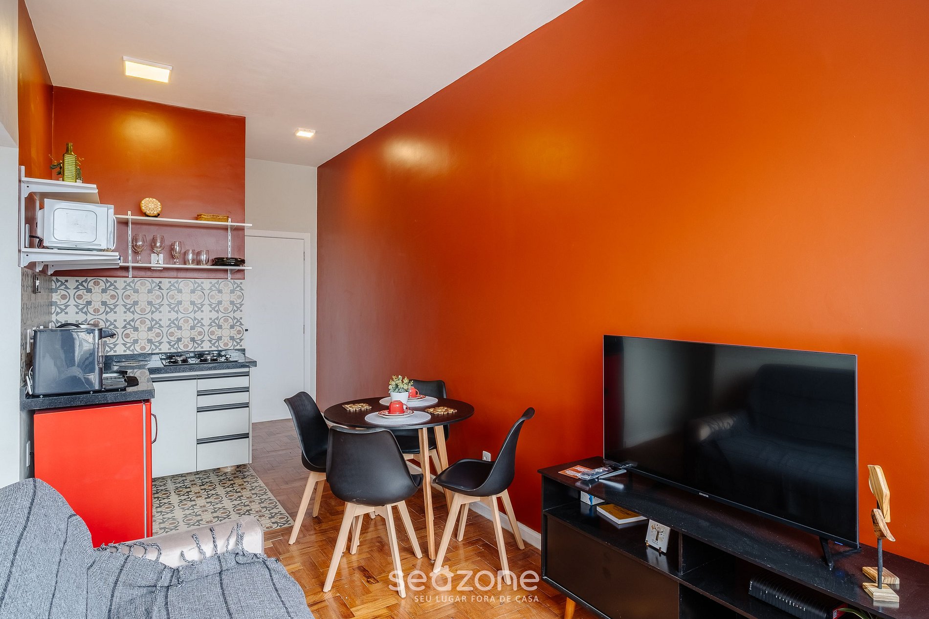 - Sala de estar com sofá, smart TV, mesa com 4 cadeiras e ventilador de teto;