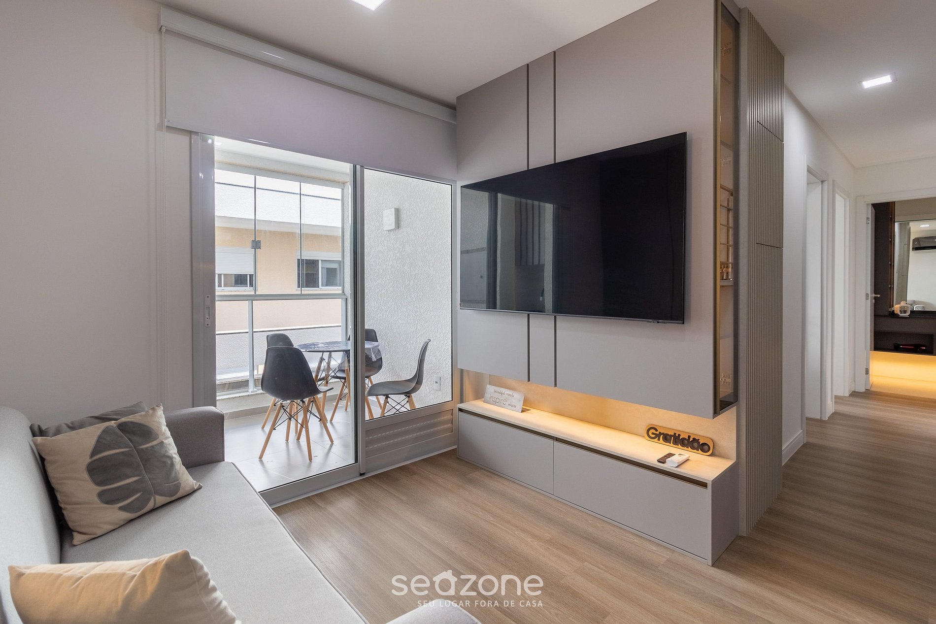 - Sala de estar com Smart TV e ar-condicionado.
