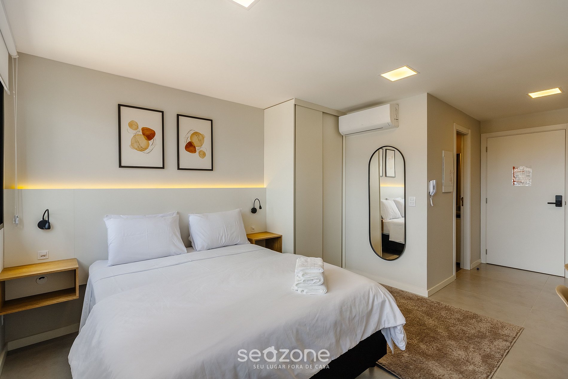 - Estúdio com 1 cama de casal queen size, smart TV de tela plana, armário e ar-condicionado;