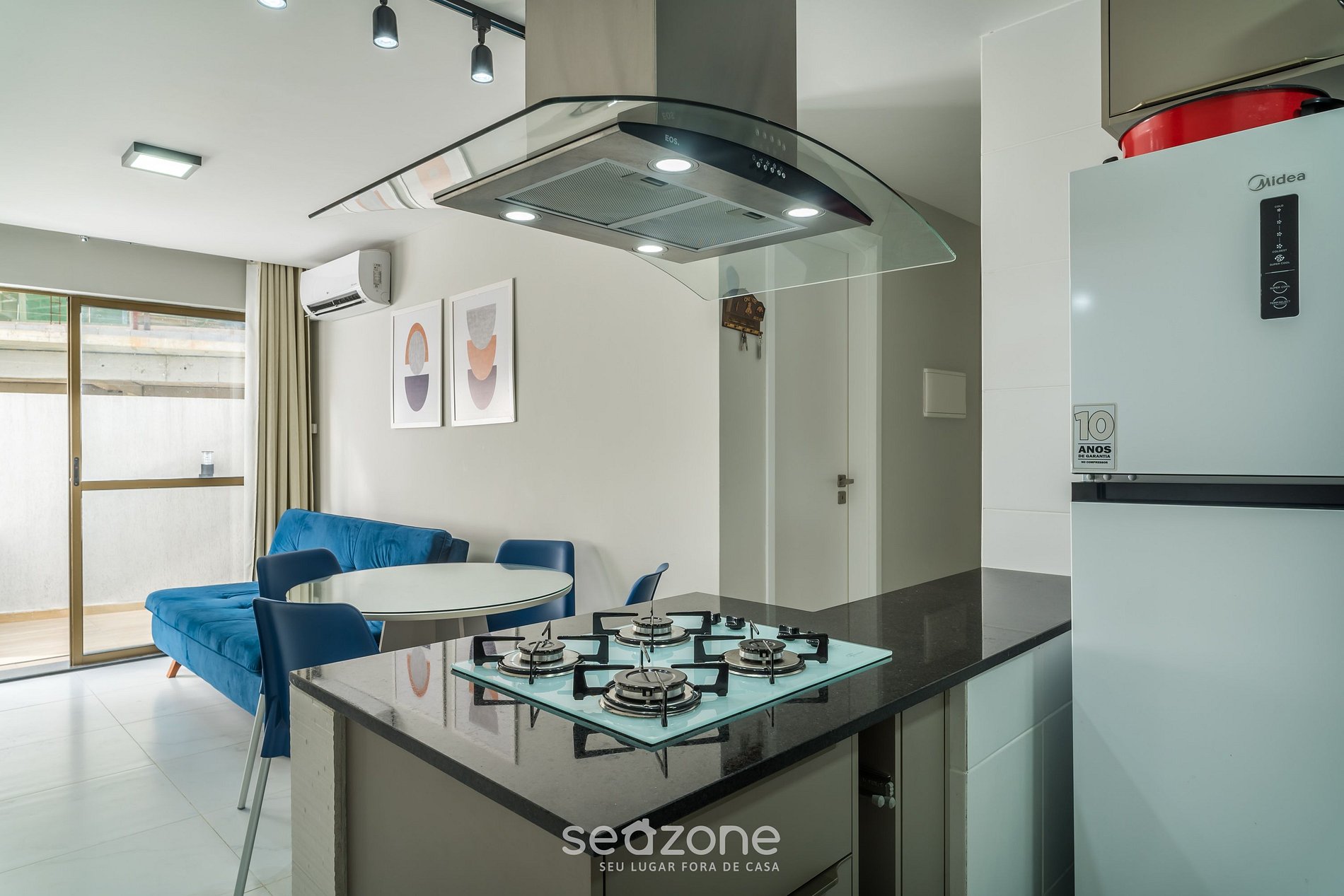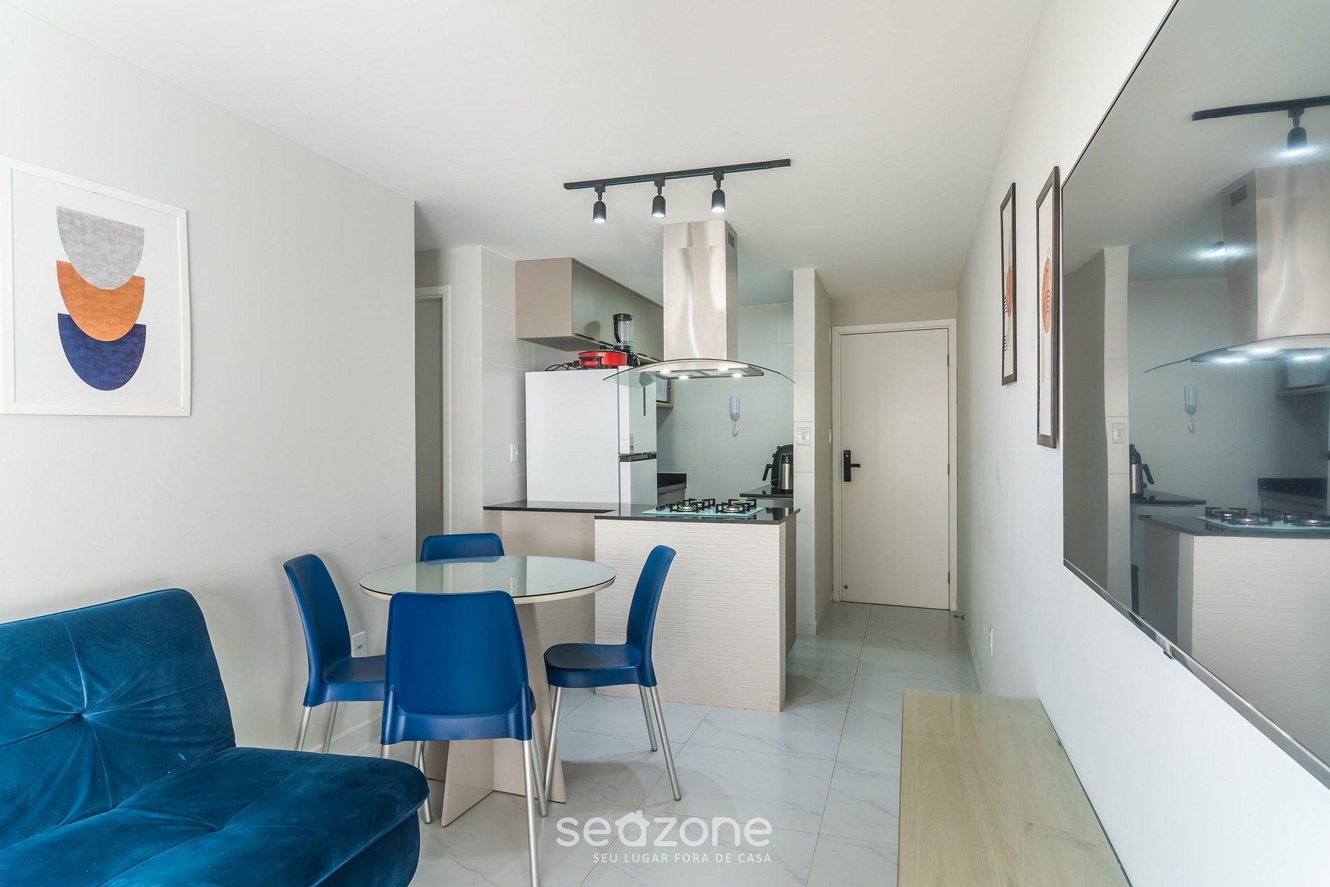 - Sala de estar com sofá-cama casal, TV Smart, mesa com 4 cadeiras e ar-condicionado;