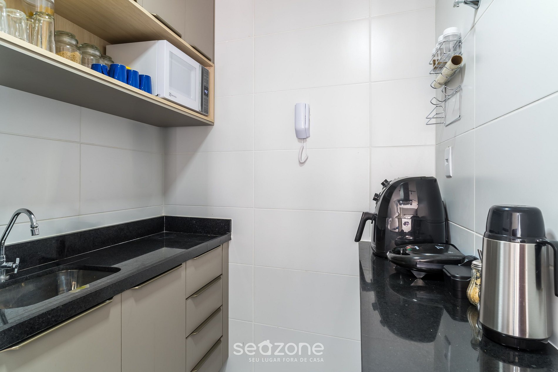 - Cozinha completa com geladeira, fogão cooktop, micro-ondas, airfryer, sanduicheira, kit café (funil, garrafa térmica), chaleira, liquidificador, taças de vinho, panelas, louças e utensílios;