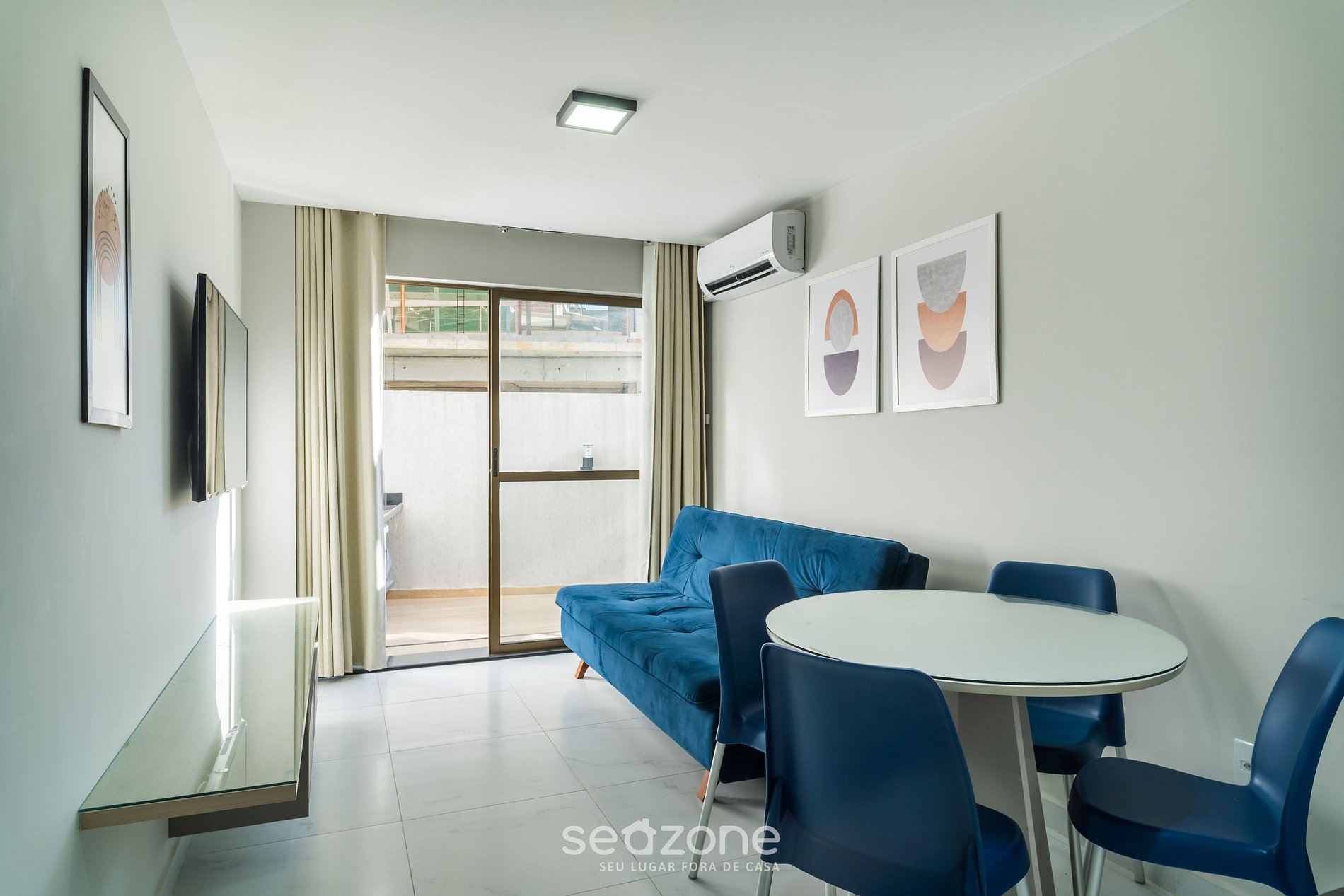 - Sala de estar com sofá-cama casal, TV Smart, mesa com 4 cadeiras e ar-condicionado;