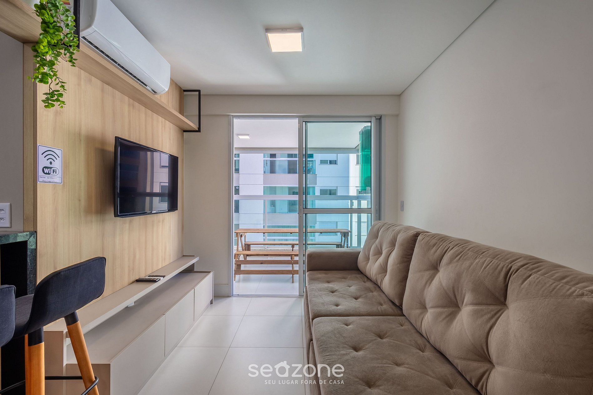 - Sala de estar com sofá, smart TV de tela plana e ar-condicionado;
