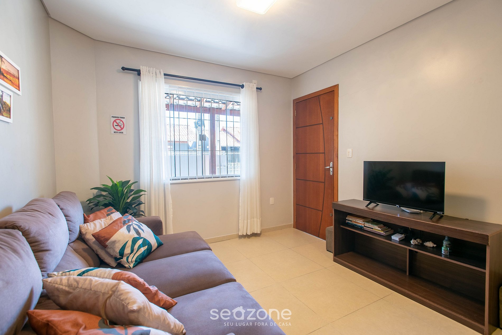 - Sala de estar com sofá, Smart TV e ventilador portátil;