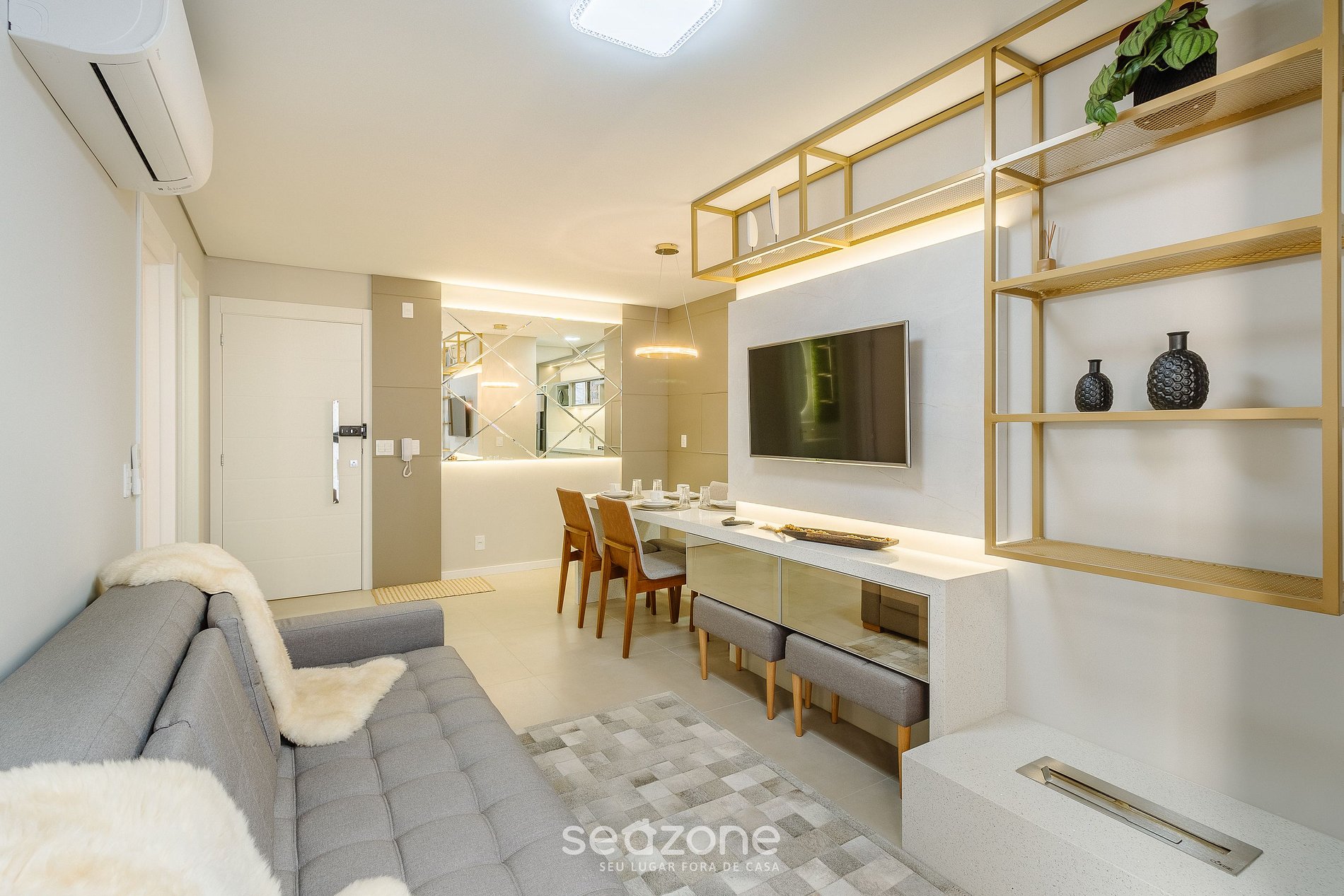 - Sala de estar com sofá-cama de casal, lareira interna, cortinas blackout, Smart TV de tela plana e ar-condicionado;