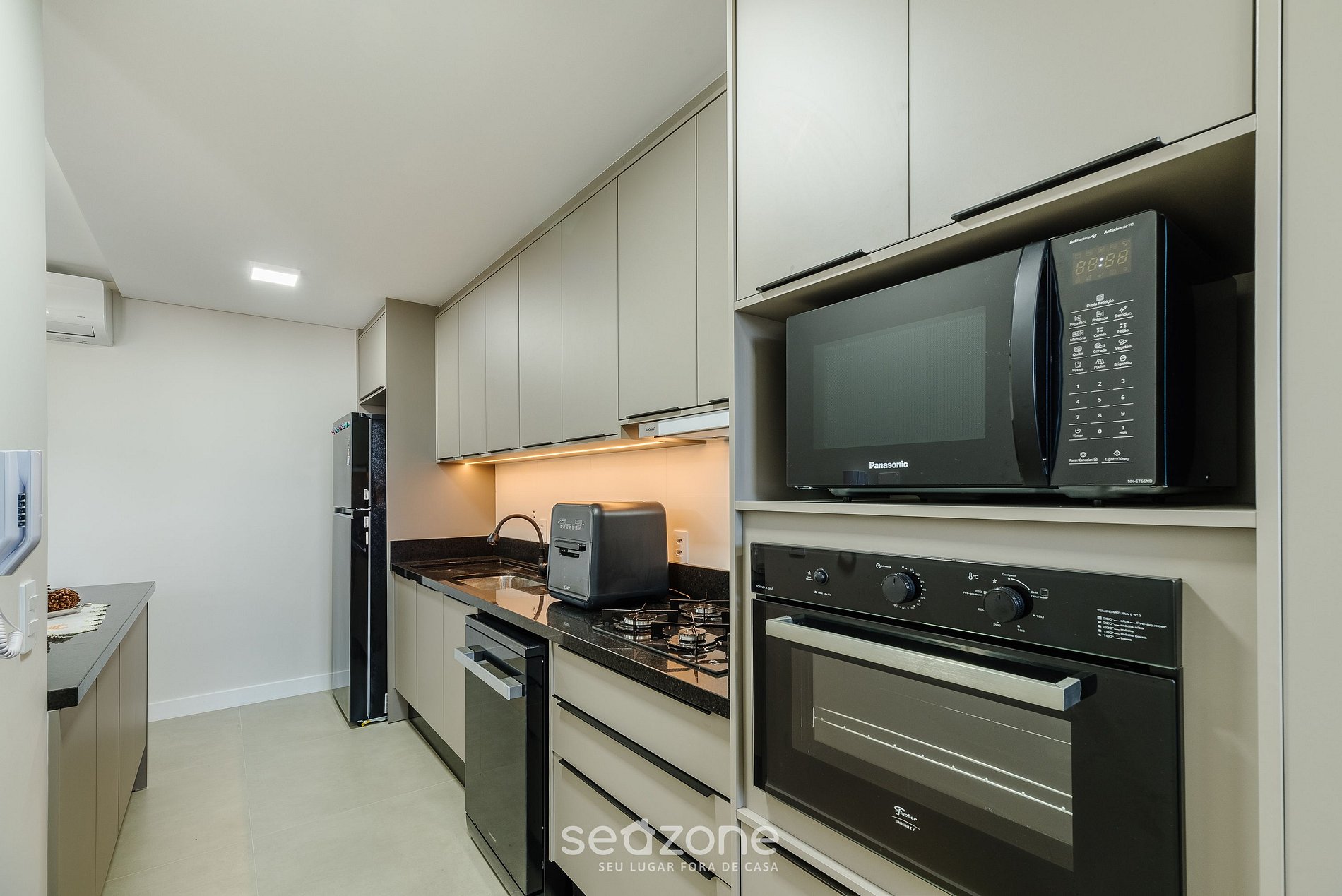 - Cozinha completa com geladeira, fogão cooktop, forno elétrico, airfryer, micro-ondas, sanduicheira, cafeteira elétrica, chaleira, liquidificador, lava-louças, taças de vinho, panelas, louças e utensílios;