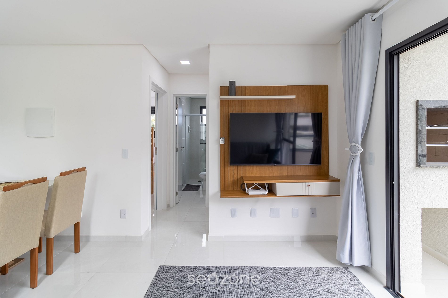 - Sala de estar espaçosa, equipada com sofá-cama, smart TV, mesa para 6 pessoas e ar-condicionado ideal para momentos de descanso e convivência;