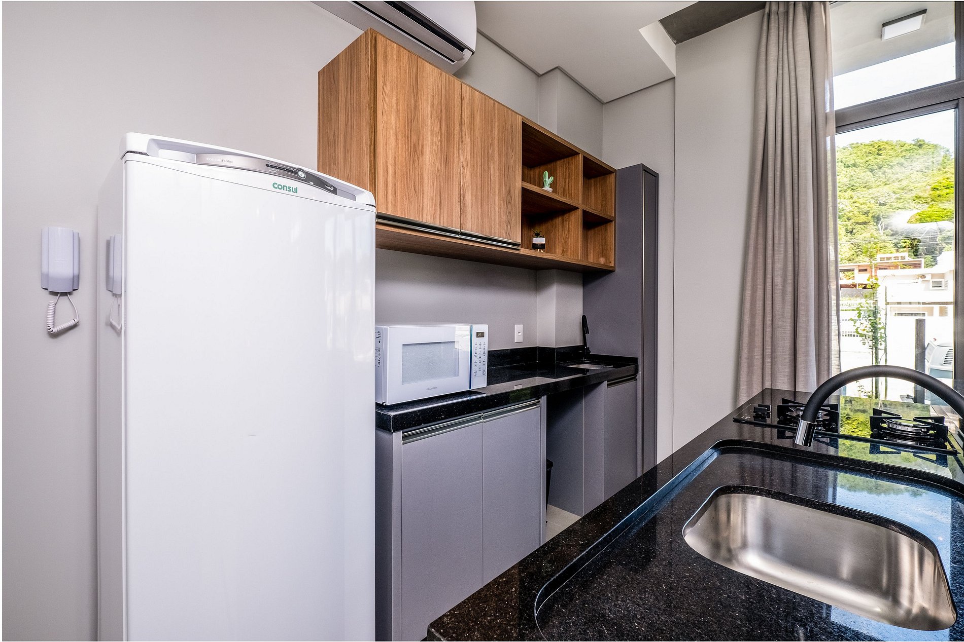 - Cozinha compacta com geladeira, fogão cooktop, micro-ondas, sanduicheira, liquidificador, panelas, louças e utensílios;
