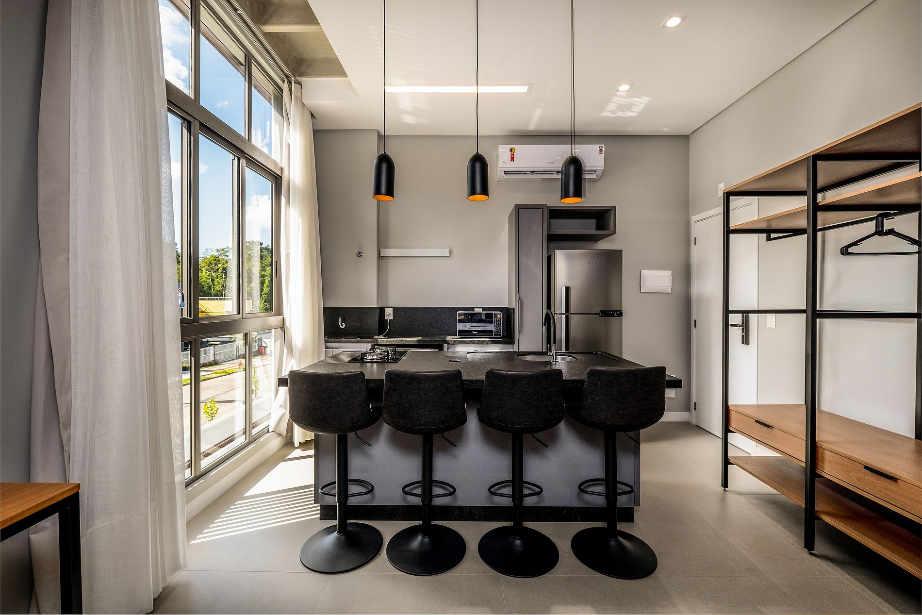 - Espaço em conceito aberto integrando ambientes de quarto, sala e cozinha;