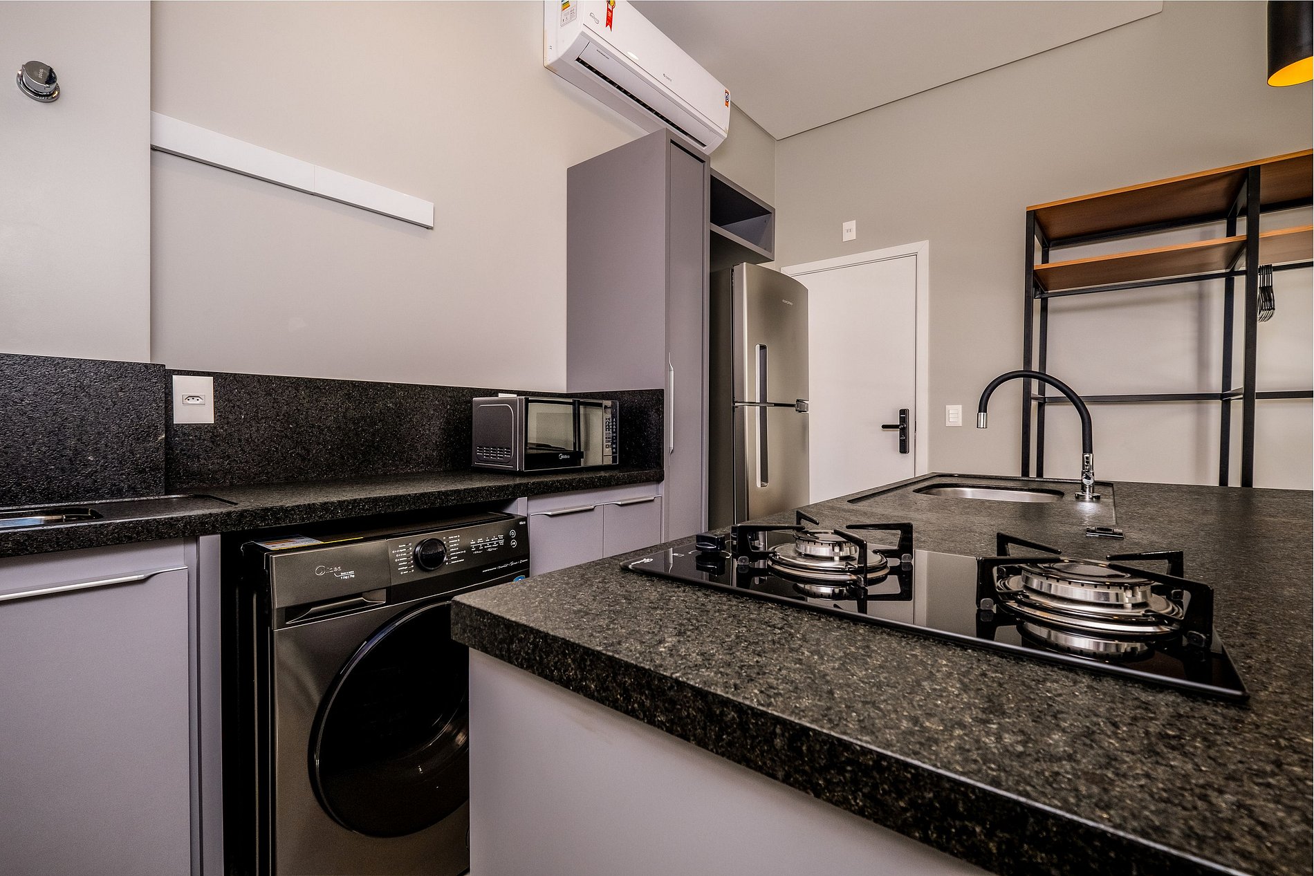 - Cozinha compacta com geladeira duplex, fogão cooktop 2 bocas, micro-ondas, forno elétrico, (filtro de água), cafeteira, chaleira elétrica, sanduicheira, liquidificador, panelas, louças e utensílios;