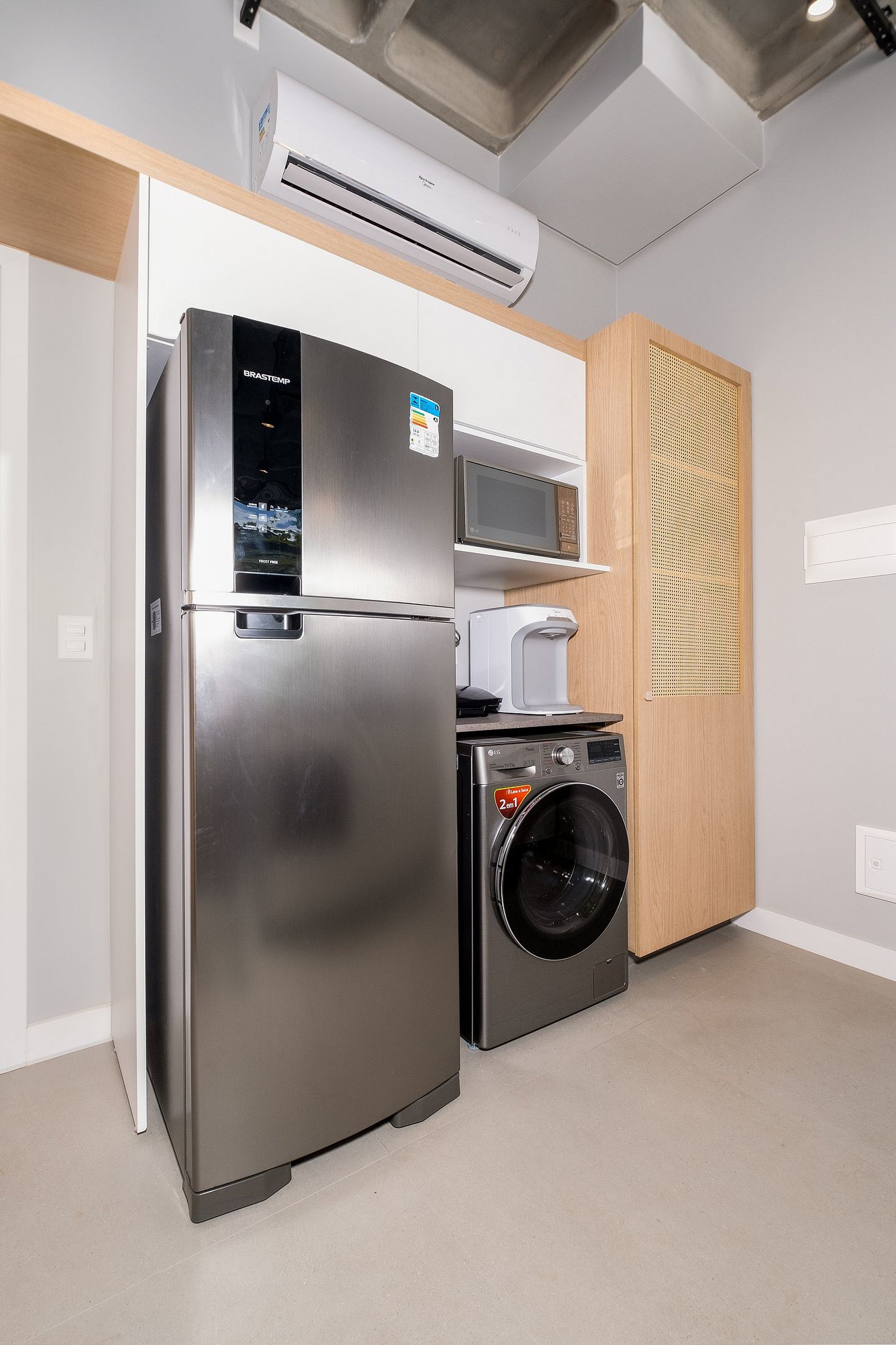 - Cozinha compacta com geladeira duplex, fogão cooktop 2 bocas, micro-ondas, forno elétrico, cafeteira, chaleira elétrica, sanduicheira, liquidificador, panelas, louças e utensílios;