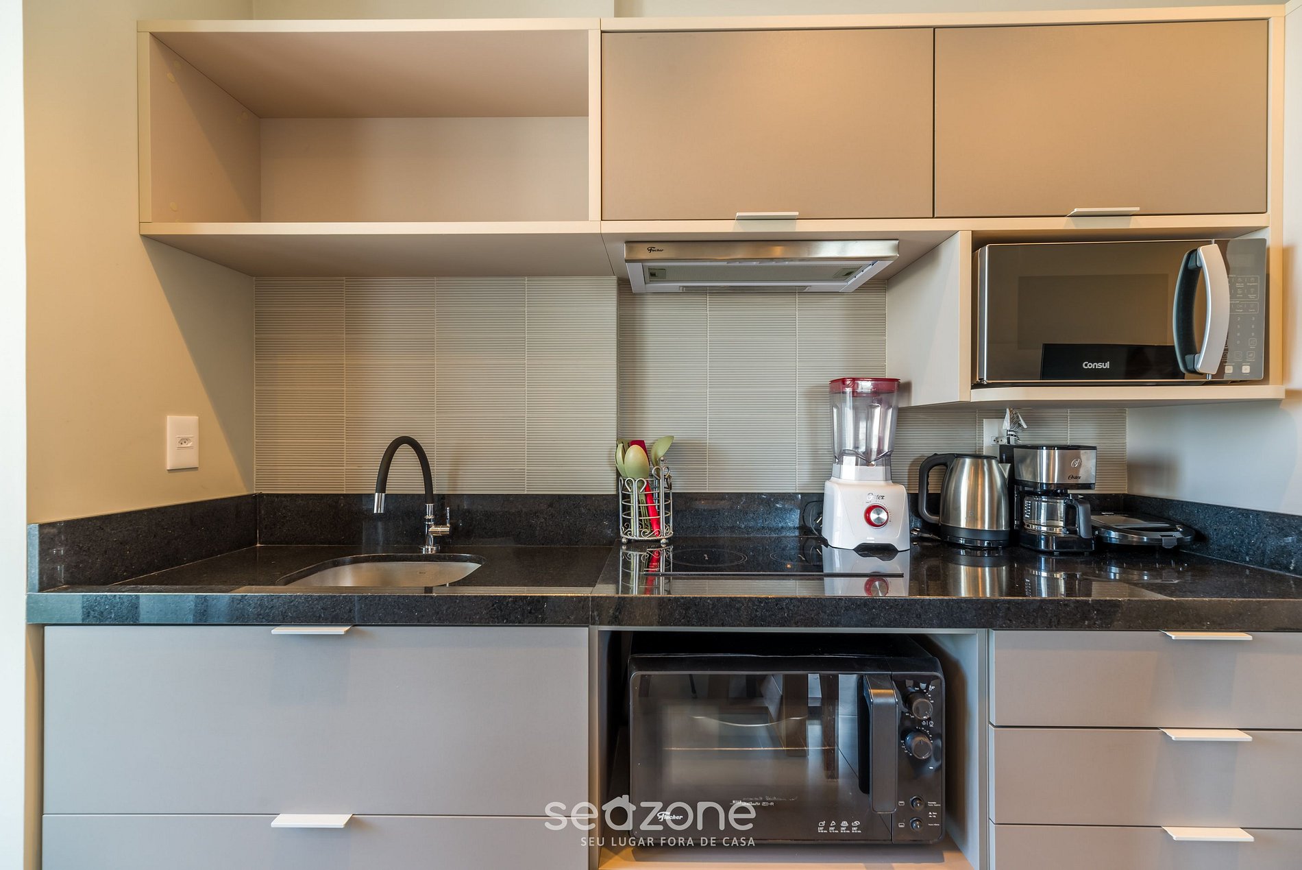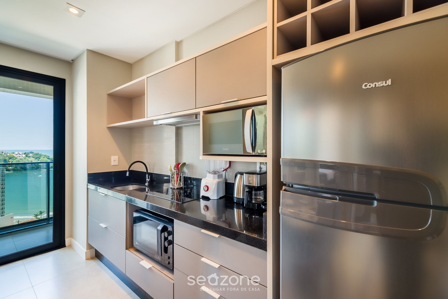 - Cozinha completa com geladeira, cooktop de indução, micro-ondas, sanduicheira, cafeteira elétrica, chaleira elétrica, taças de vinho, panelas, louças e utensílios;