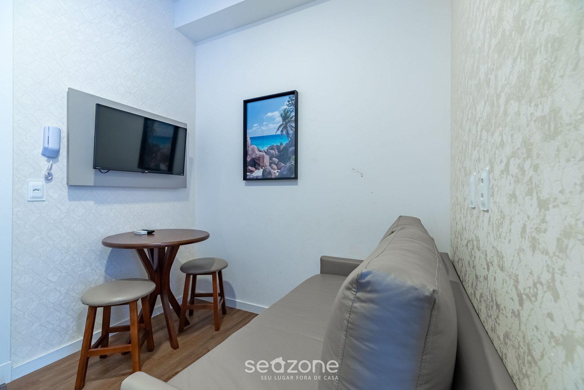 - Studio com sofá cama casal (comporta 1 adulto e 1 criança de até 12 anos), cama casal queen size, armário, TV e cozinha integrada;