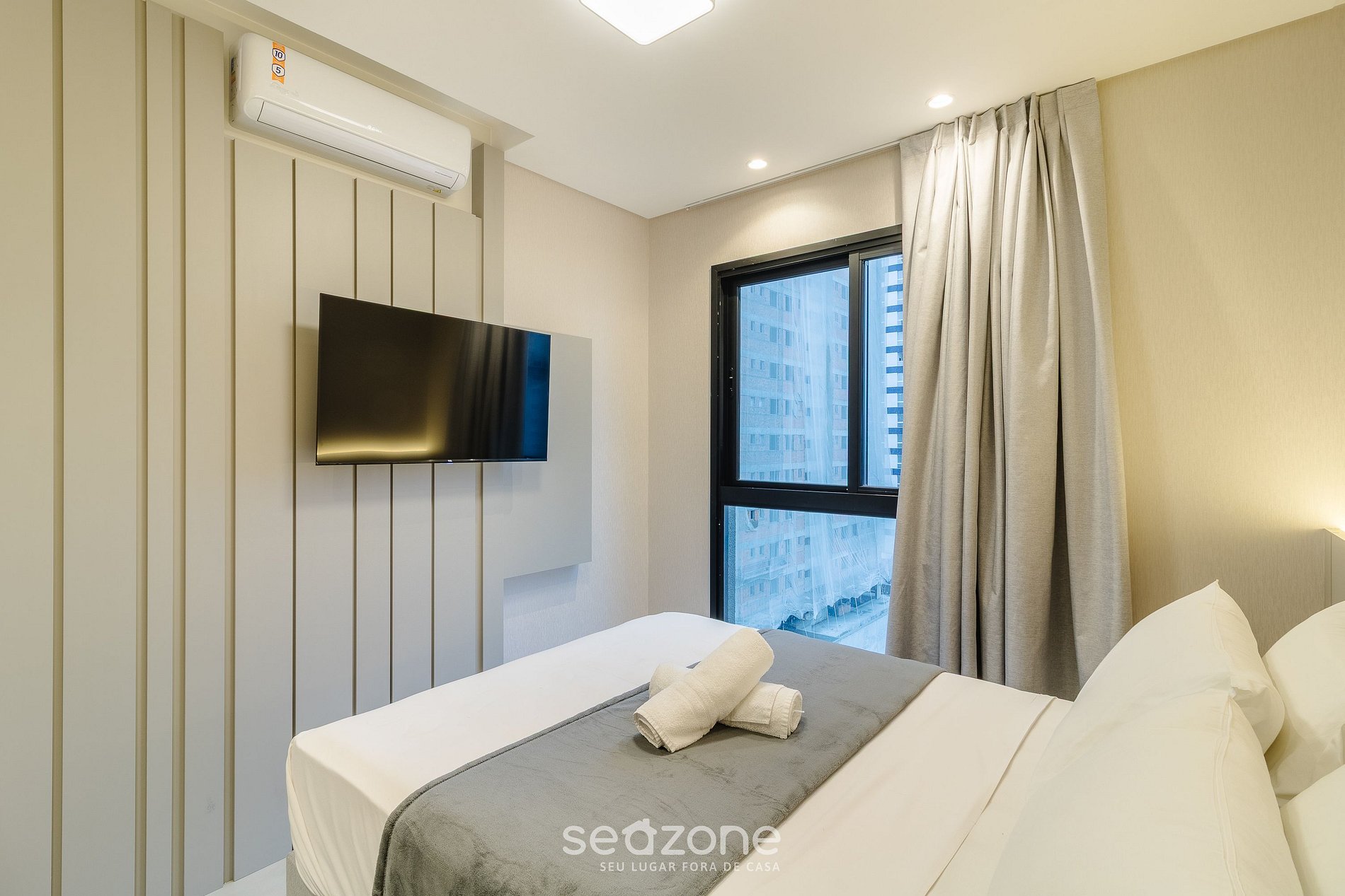 Possui quarto climatizado com cama de casal e Smart TV, sala com ar-condicionado, cozinha equipada e varanda com vista para a cidade. O prédio conta com piscina, academia moderna, salão de jogos e lavanderia. Localizado próximo ao Hard Rock Café e às melhores opções gastronômicas e comerciais de Meia Praia.