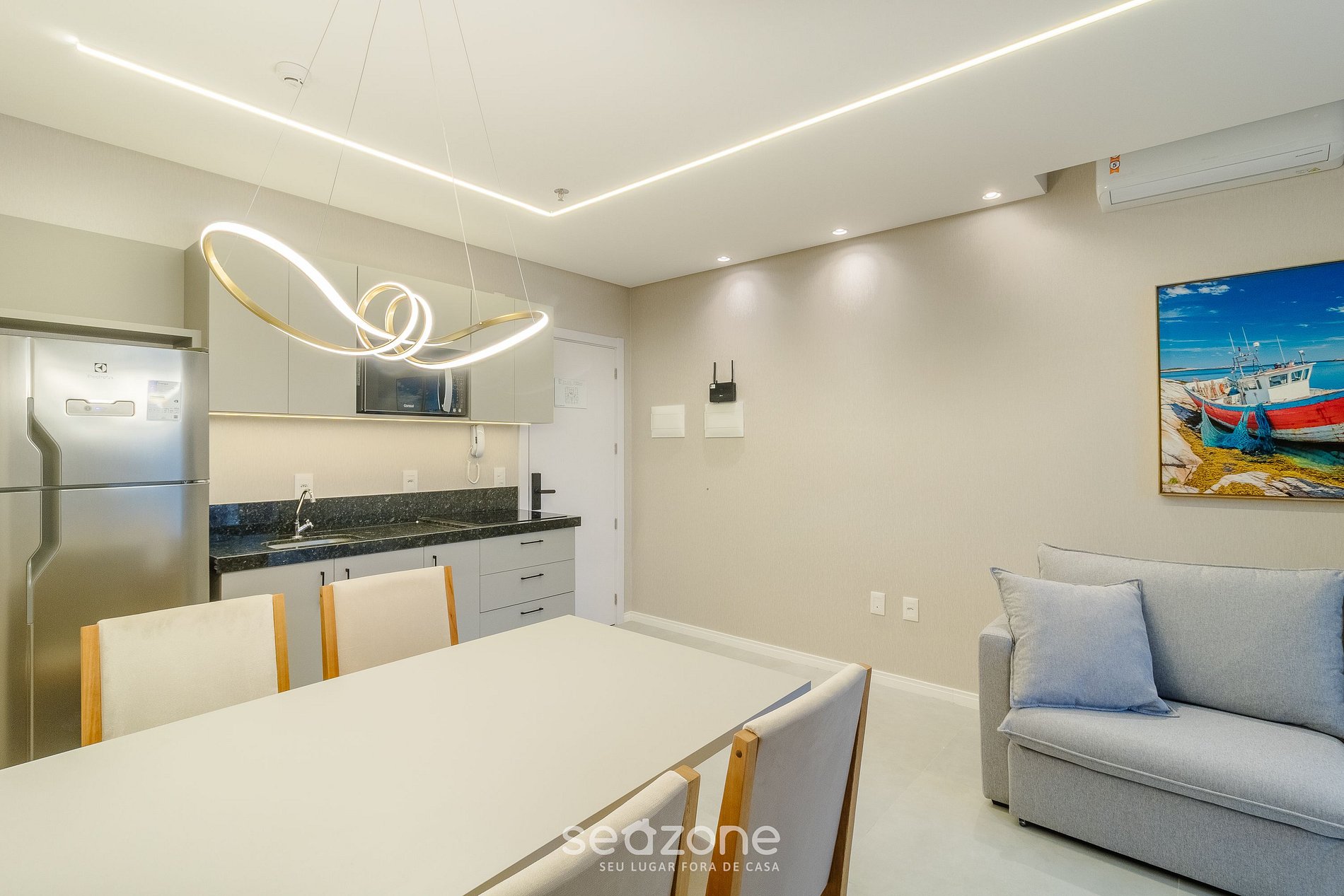 Possui quarto climatizado com cama de casal e Smart TV, sala com ar-condicionado, cozinha equipada e varanda com vista para a cidade. O prédio conta com piscina, academia moderna, salão de jogos e lavanderia. Localizado próximo ao Hard Rock Café e às melhores opções gastronômicas e comerciais de Meia Praia.