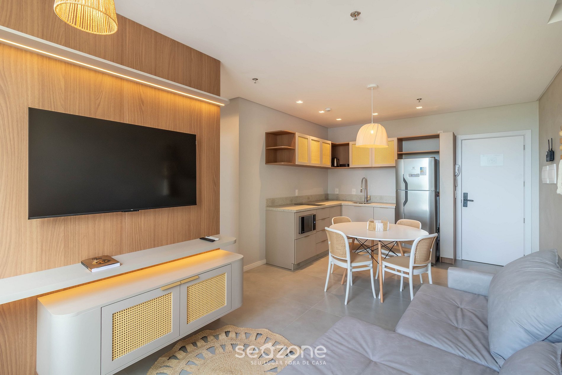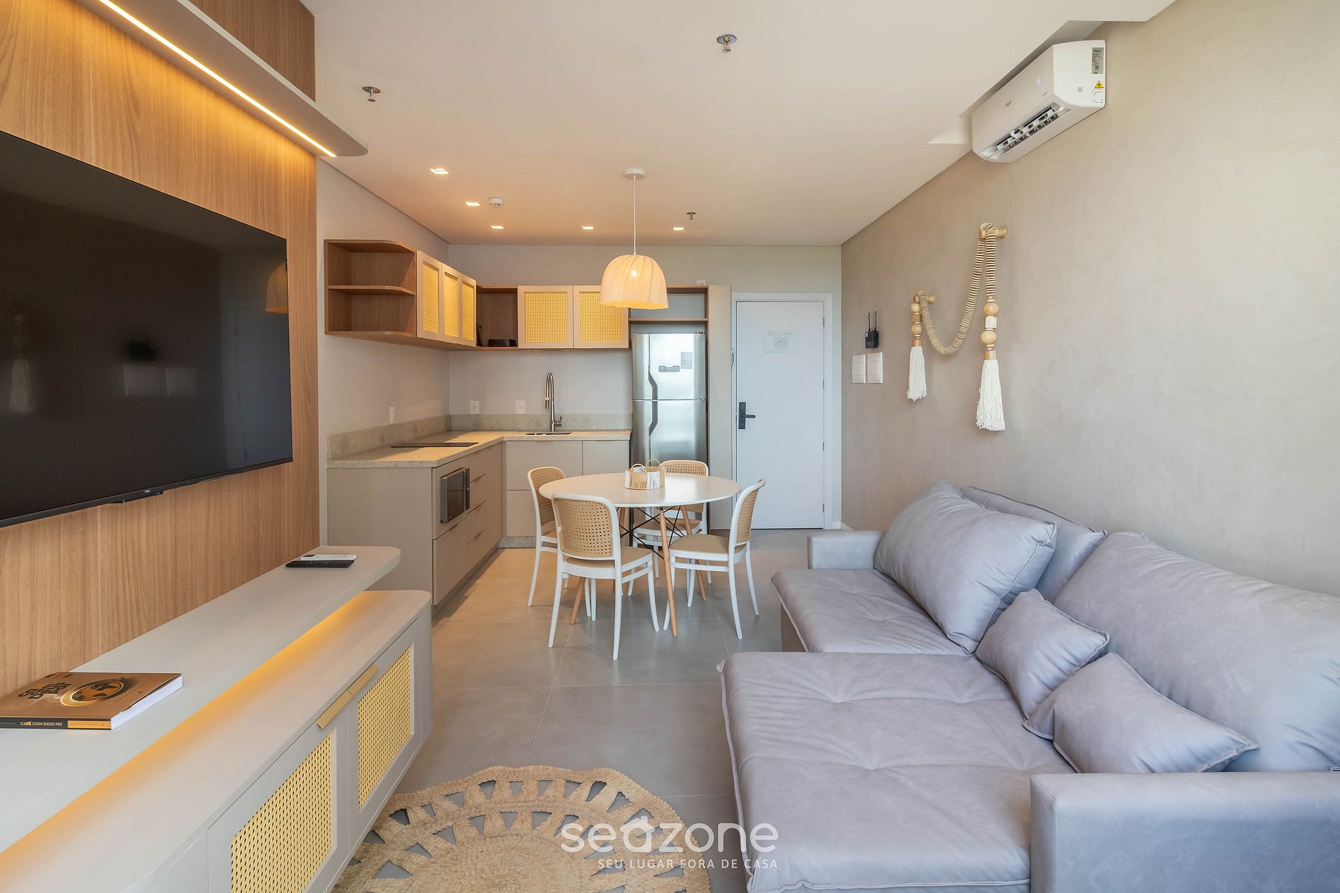 - Sala de estar com Sofá, Smart TV e ar-condicionado;