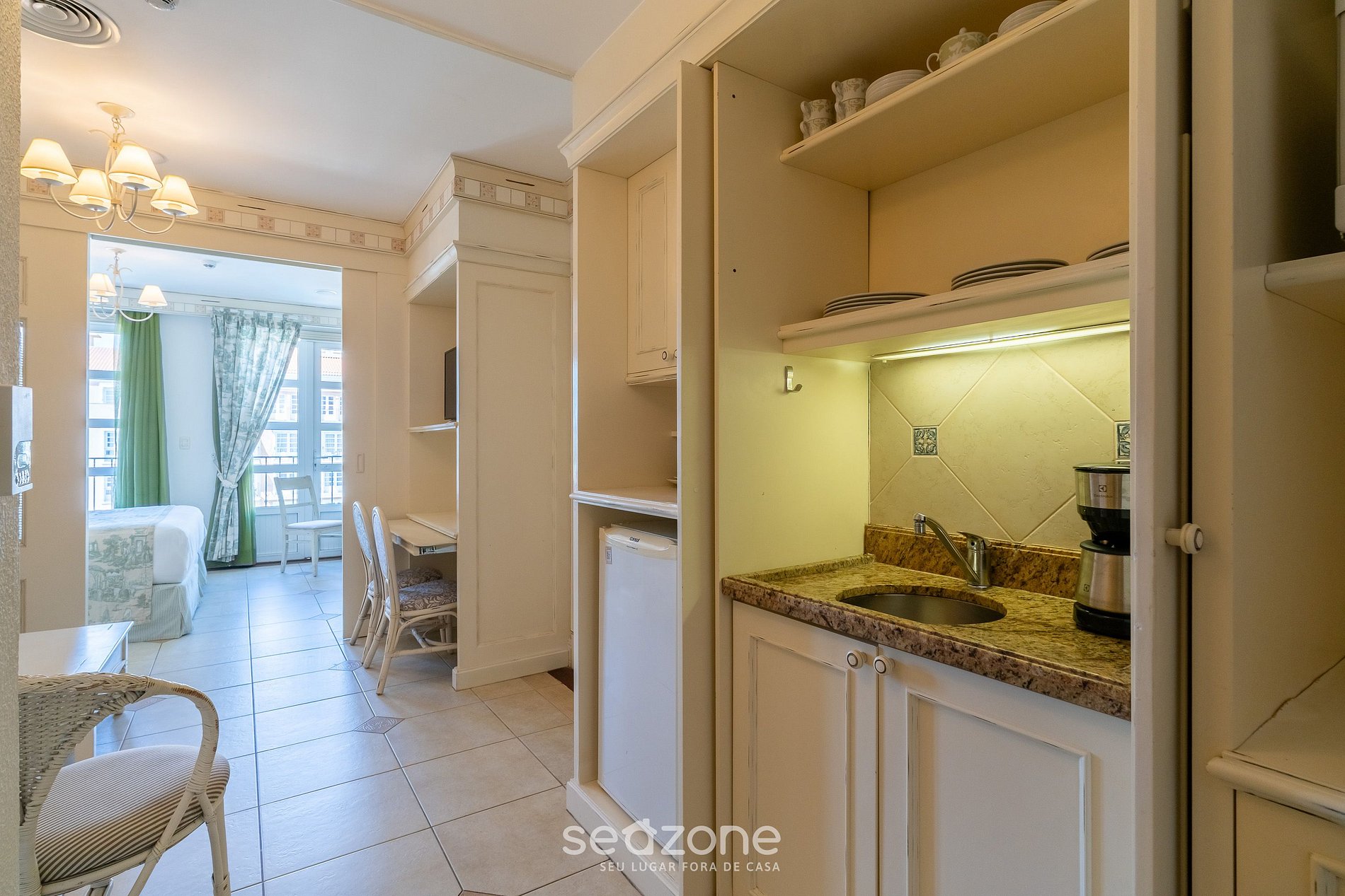 - Mini cozinha com microondas, frigobar, cafeteira e utensílios domésticos;