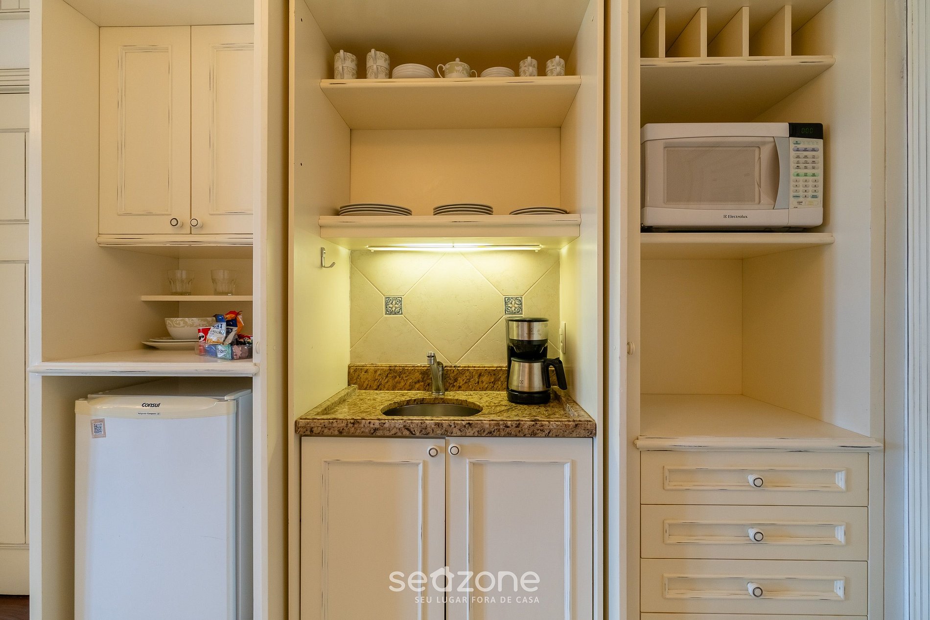 - Mini cozinha com microondas, frigobar, cafeteira e utensílios domésticos;