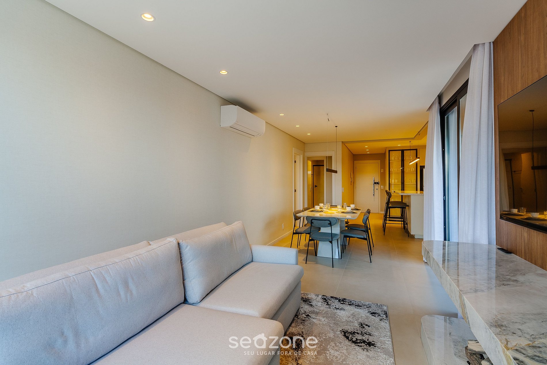 - Sala de estar com sofá-cama, Smart TV, mesa com 6 cadeiras e ar-condicionado;