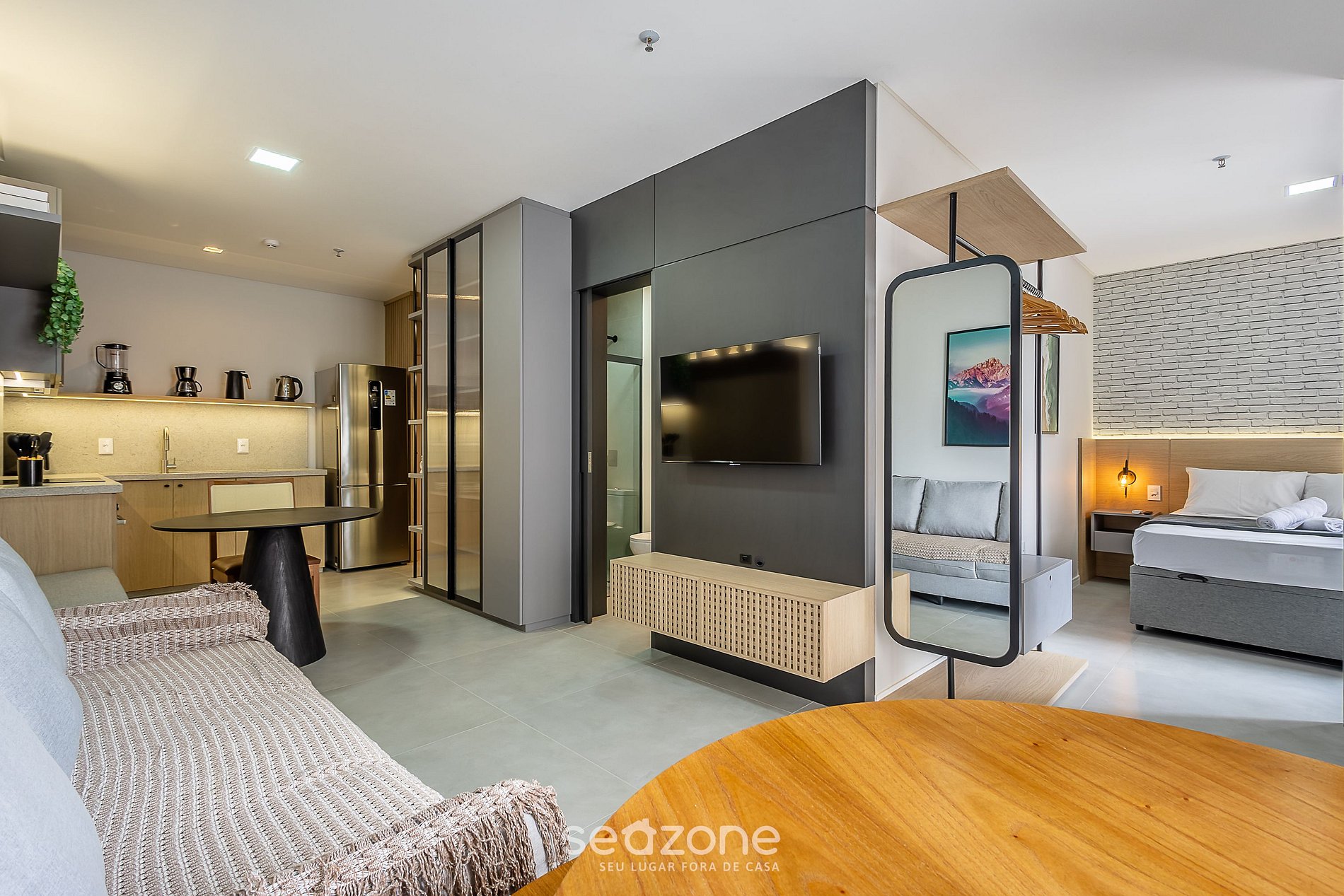 - Sala com sofá, smart TV e ar-condicionado;