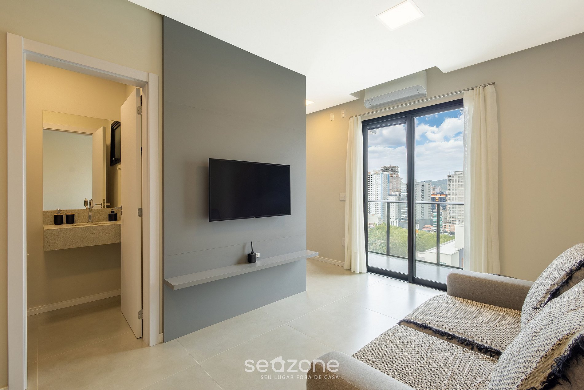 - Espaço com sofá, Smart TV e ar-condicionado;